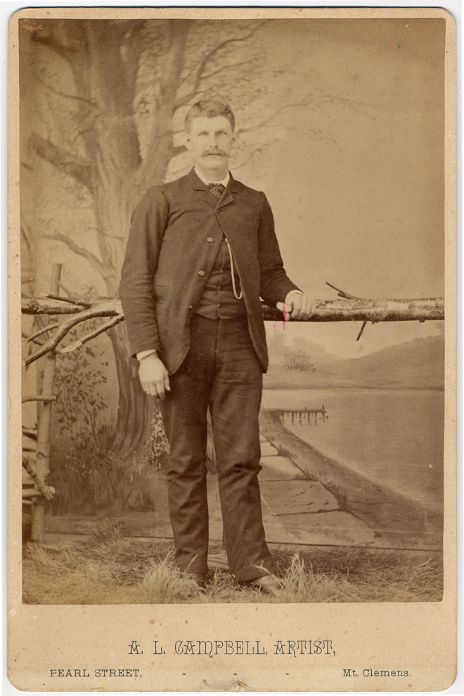 Portrait of a man standing, leaning on a branch in front of a studio nature background; hair combed to the front, with mustache, wearing a suit jacket, vest, pants, and tie, a watch chain visible. Printed on photo front: "A.L. Campbell, artist, Pearl Street, Mt. Clemens."