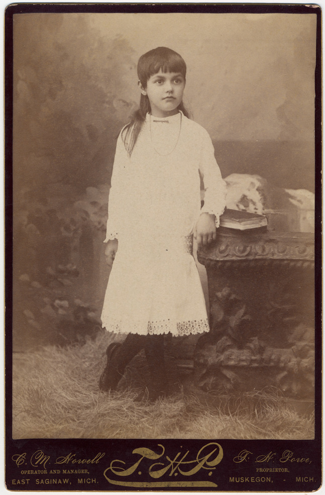 Portrait of a girl with bangs and hair short in front and long in back, wearing a light-colored dress with lace trim on edges of sleeves and hem, a brooch around the collar and beads, dark-colored stockings and dark-colored shoes. Printed on photo front: "C.M. Howell, operator and manager, East Saginaw, Mich. T.H.P., T.H. Powe, proprietor, Muskegon, Mich."