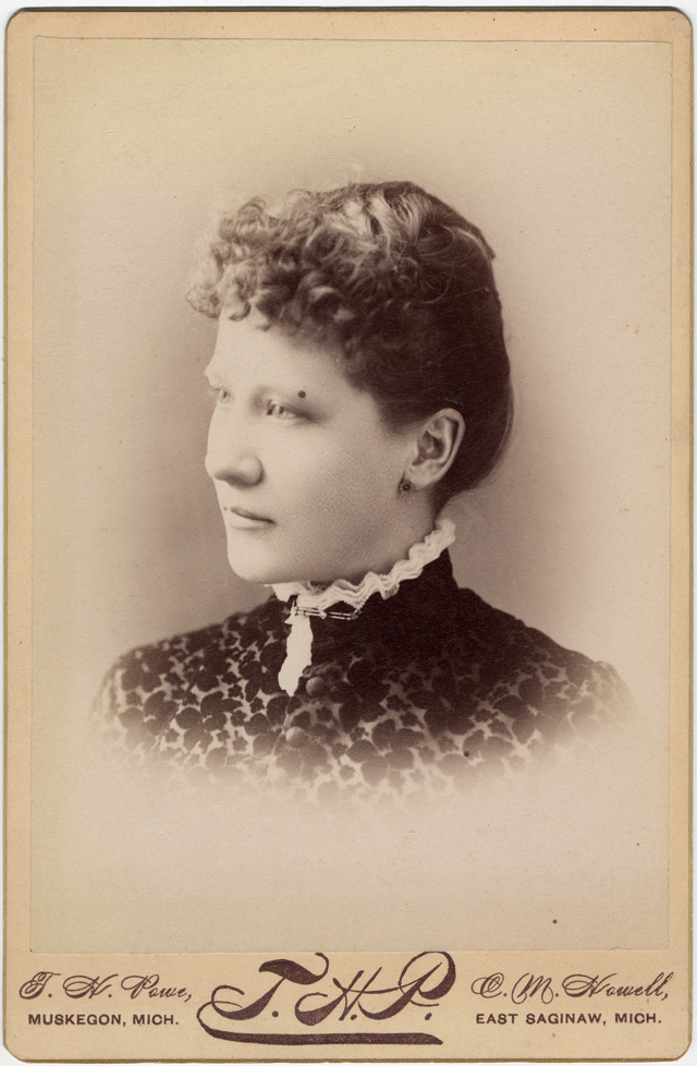 Portrait of a woman with curly bangs,rest of the hair pulled back, wearing earrings and a dark-colored flower-patterned bodice with light-colored, ruffled collar with pin. Printed on photo front: "T.H. Powe, Muskegon, Mich., T.H.P., C.M. Howell, East Saginaw, Mich."