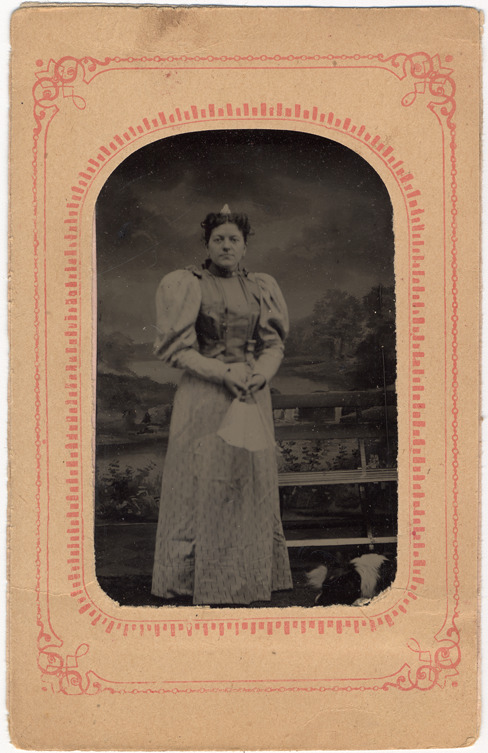 Portrait of a woman standing before a painted bucolic scene, holding a fan and dressed in light colors with a dog laying at her feet, hair parted down the middle and pulled back with a decorative comb at the back. Dress has long leg-of-mutton sleeves and contrasting-colored bodice. Mounted in paper case, inside is printed: "J.C. Barton, 108 Huron Ave., Port Huron, Mich. "