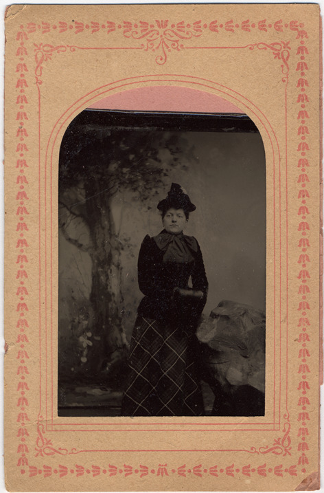 Portrait of a woman standing next to a fake rock, painted tree in background, hands in a muff and dressed in plaid skirt, bodice with large tie at throat, and hat. Mounted in paper case, printed on back: "J.C. Barton, artist, 108 Huron Ave., Port Huron, Mich. "
