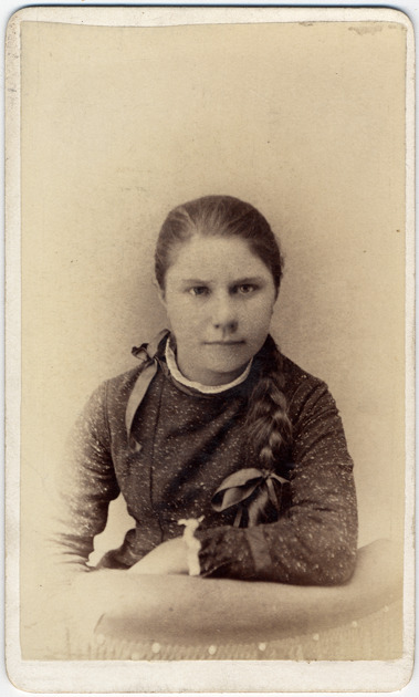 Portrait of a young girl leaning on photographer's chair and looking directly at camera, single braid over shoulder, wearing a tweed dress, neckline edged with lace. Printed on photo back: "W.S. Beebe, Central Art Gallery, opposite National Hotel, Owosso, Mich."