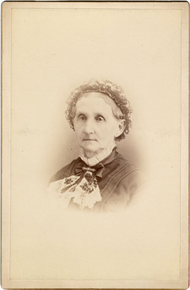 Portrait of an elderly woman wearing a lace cap, a dark-colored dress and ruffled collar. Printed on photo back: "Ben Cuyler, photographic artist, Romeo, Mich. Negatives carefully reserved, satisfaction guaranteed. Copying and enlarging India ink and water coloring."