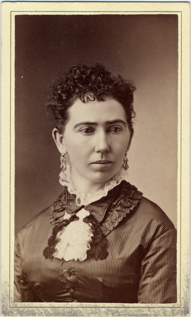 Portrait of a woman with earrings and curly hair pulled up, wearing a striped dress with buttons down the middle and a ruffled collar with jabot. Printed on photo back: "Photographic art parlors, Dan W. Smith, Hamilton Street, Nathan Block, Saginaw City, Mich. Negatives are retained for future orders."