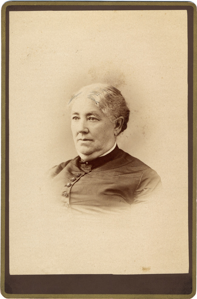 Portrait of a woman with gray hair parted down the middle and pulled back wearing a dark-colored dress with buttons down the middle. Printed on photo back: "I.O. Chapman, photographer, Gardner Block, Stanton, Mich."