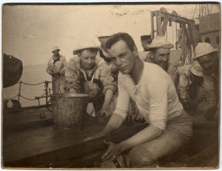Sailors cleaning deck of the ship; several have sponges, and there is a bucket beside them. All are in white Navy uniforms except for sailor in foreground, who wears a white long-sleeved shirt and no cap. Another man wears a dark uniform in the background.