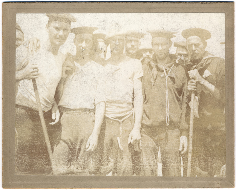 Group of sailors posing for picture, five predominant in foreground and several more behind them.Three are wearing white shirts, two are wearing full dark uniforms, all are wearing U.S. Navy hats. Two are holding broom or mop. Handwritten on back: "E.B. Nall."