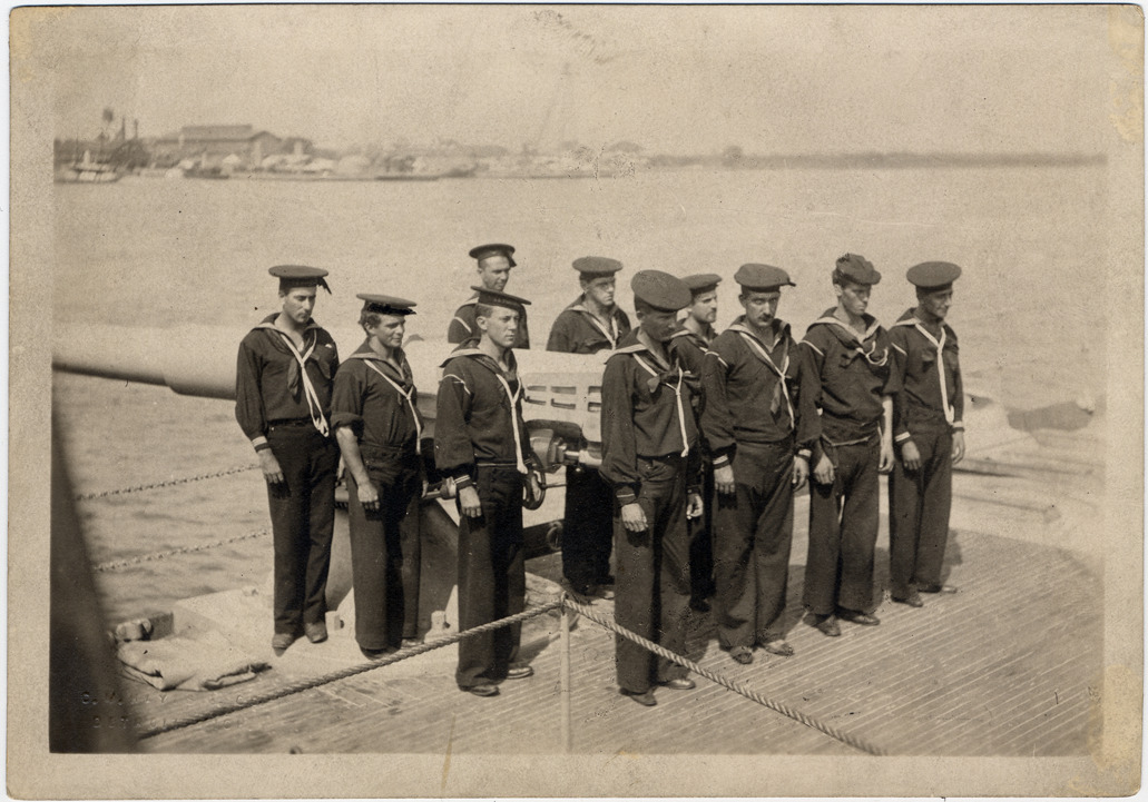 Ten sailors posing around cannon on ship at sea. Embossed on front: "C.M. Hayes & Co., Detroit, Mich." Handwritten on back: "Henry W. Standart, Edw. W. Macleod, A.D. McAdams, Herbert W. Flint, Paul F. Bagley, Geo. T. Hendrie, Alfred R. Blome, Chas R. Hargreaves, Jamie B. Pell, Edwin B. Nall. Gun crew on U.S.S. 'Yosemite', 1898. Edwin B. Nall."
