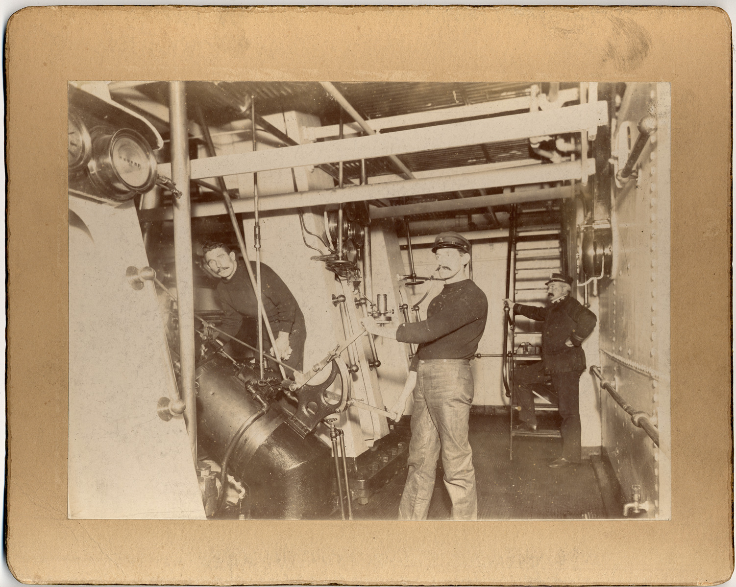 Favorite this☆ Engine room of U.S.S. Yosemite Description: Two engineers and officer in engine room. Handwritten on mat back: "Engine room, U.S.S. Yosemite. Chief engineer M.E. Cooley in background with foot on ladder." Details Resource ID: DPA1607 Subject: Spanish-American War, 1898 Yosemite (Cruiser) Sailors--United States Marine engines Albumen prints Photographic prints Date Issued: 1898 (year approximate) Format: 1 photographic print mounted on mat board ; image 6 x 8.25 in. Member of: Burton Historical Collection Filing Location: M/History-Spanish-American War, 1898 Rights: Physical rights are retained by DPL. Copyright is retained in accordance with U.S. copyright laws.
