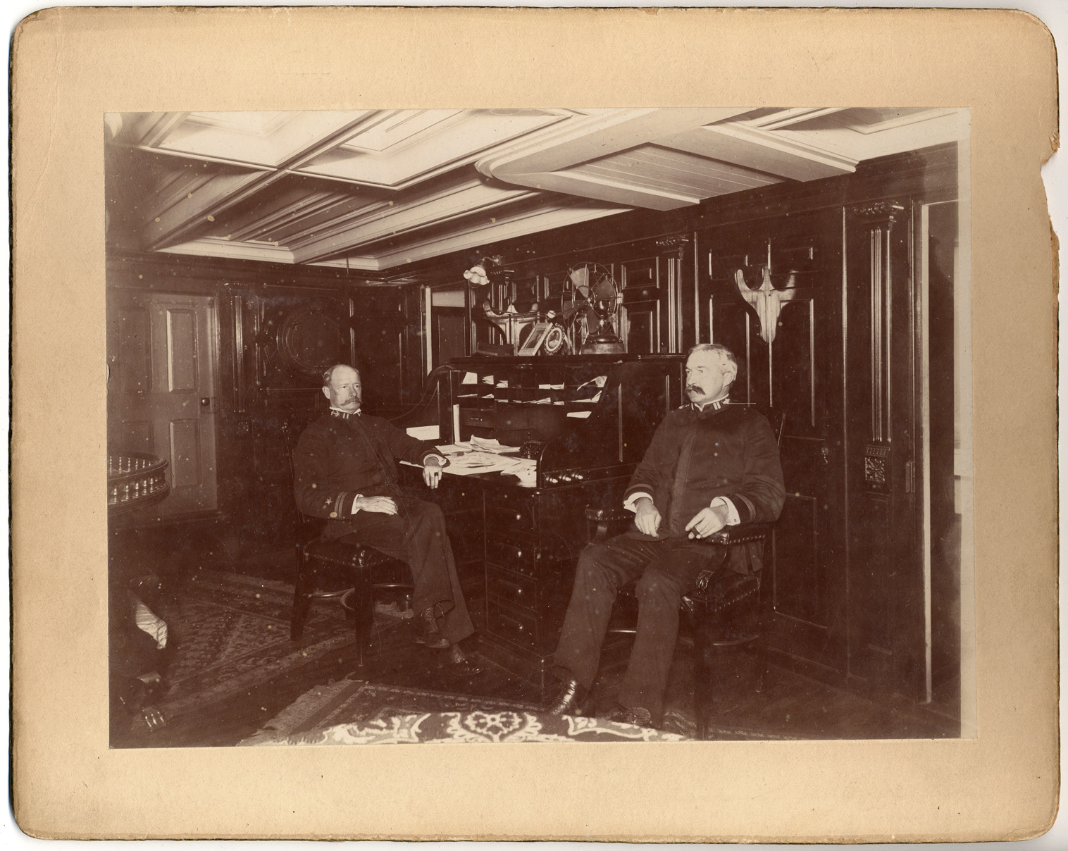 Two officers sitting by desk in paneled cabin. Handwritten on mat back: "U.S.S. Yosemite. View in cabin. Lieut. Sawyer - comdg officer. Ch. engr. Cooley - chief engineer. Notes by Charles B. King, Sept. 6th, 1945: The above statement is incorrect for this photo was not taken on the Yosemite. The officer on the right is Chief M.E. Cooley. - C.B.K."