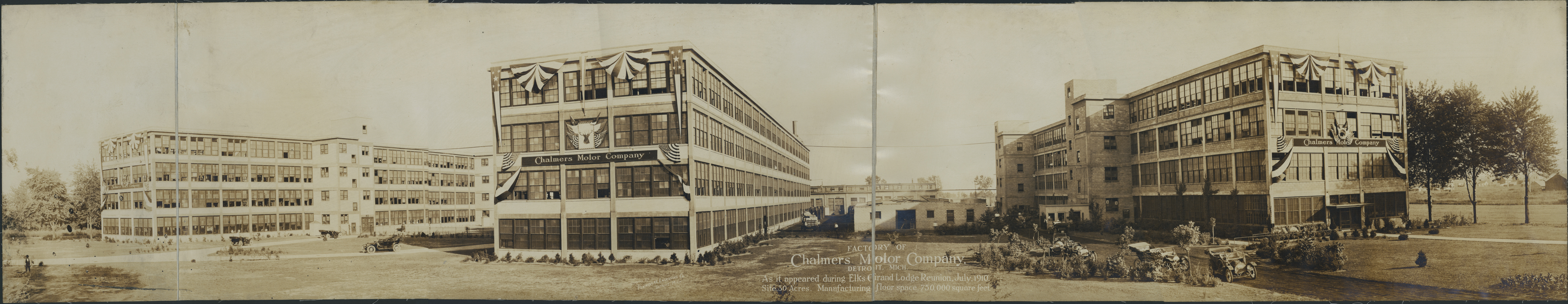 Panoramic view of factory. Several cars on drives near buildings. One man standing in far left. Other buildings on far right. Flags and bunting with picture of elk on the ends of factory buildings. Printed on photograph front: "Factory of Chalmers Motor Company, Detroit, Mich. As it appeared during Elks Grand Lodge Reunion, July, 1910. Site 30 acres. Manufacturing floor space 750,000 square feet. Photo by Peninsular Engraving Co., Detroit, Mich."