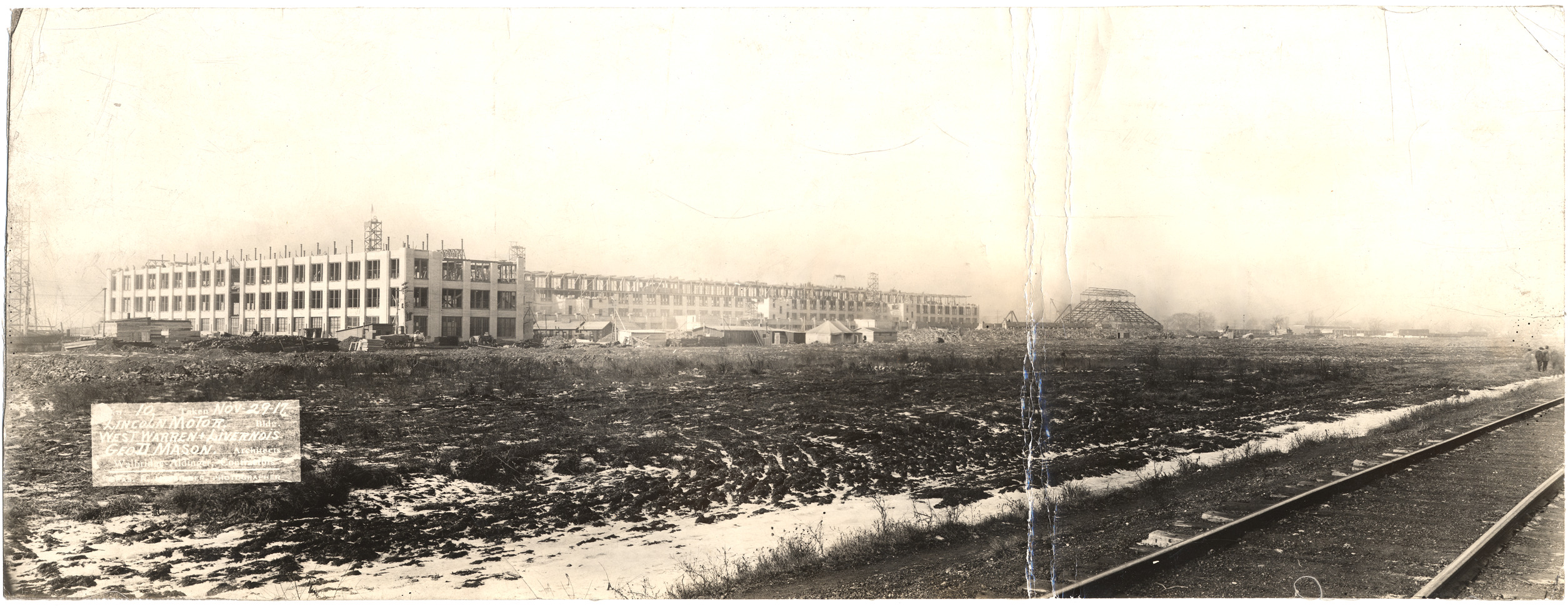 Lincoln factory under construction. Walls of main plant partially in place. Girders for steep-roofed structure in place at end. Several small buildings and tent for contractors. Horse-drawn wagons. Some snow on ground. Printed on photograph front: "No. 10, taken Nov.-29-17, Lincoln Motor bldg.,West Warren - Livernois, Geo. [George] D. Mason, architects, Waldbridge-Aldinger, contractors, Chas. [Charles] R. Messinger, photographer." Stamped on photograph back: "Charles R. Messinger, commercial photographer, 1646 Woodward Ave., Detroit, Mich., market 6798." Handwritten on photograph back: "15."
