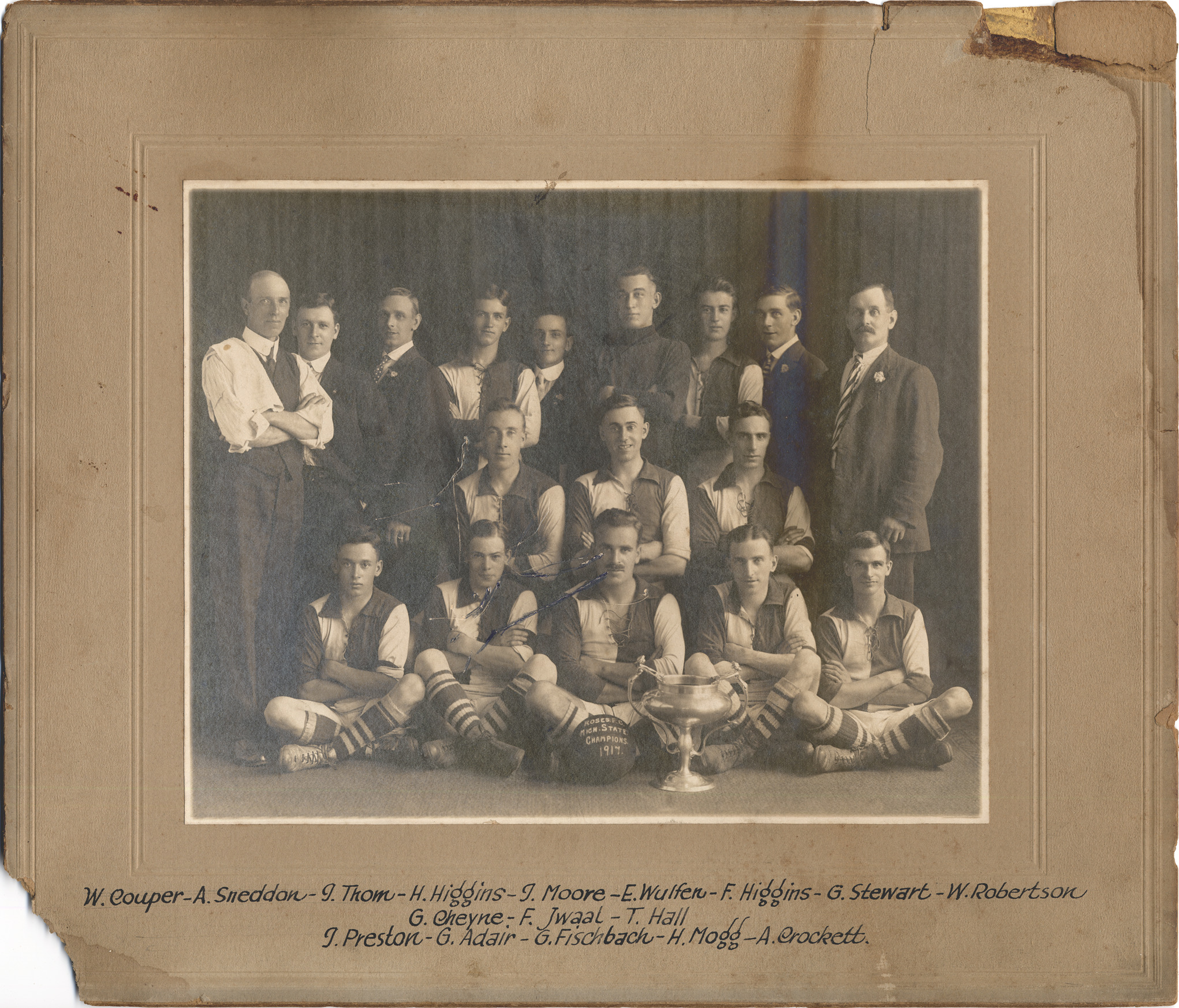 Members and coaching staff of Roses F.C. Written on ball in photograph: "Roses F.C. Mich. state champions, 1917." Trophy in front by ball. Handwritten on mat front: "W. Couper, A. Sneddon, J. Thom, H. Higgins, J. Moore, E. Wulfen, F. Higgins, G. Stewart, W. Robertson, G. Cheyne, F. Jwaal, T. Hall, J. Preston, G. Adair, G. Fischbach, H. Mogg, A. Crockett."