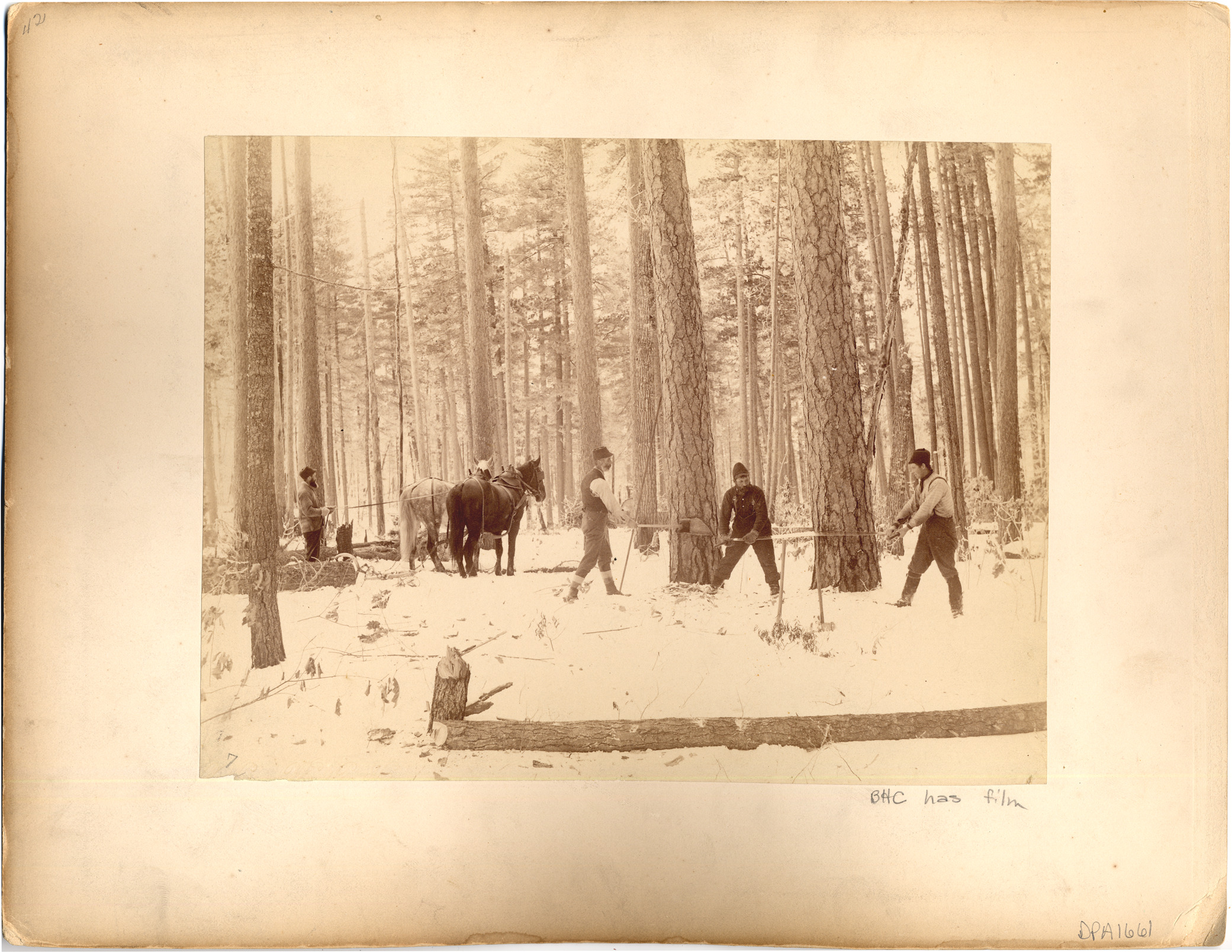Favorite this☆ Three men cutting trees Description: Two men using crosscut saw on standing tree; one man using axe on another. Man with team of horses to the side. Snow on the ground; fallen tree in foreground. Details Resource ID: DPA1661 Subject: Loggers--Michigan Logging--Michigan Albumen prints Photographic prints Date Issued: Unknown year Format: 1 photographic print mounted on mat board ; image 7.25 x 9.5 in. Member of: Burton Historical Collection Filing Location: M/Lumber industry & trade Note (Content): DPA1660 on other side of mat Rights: Physical rights are retained by DPL. Copyright is retained in accordance with U.S. copyright laws.