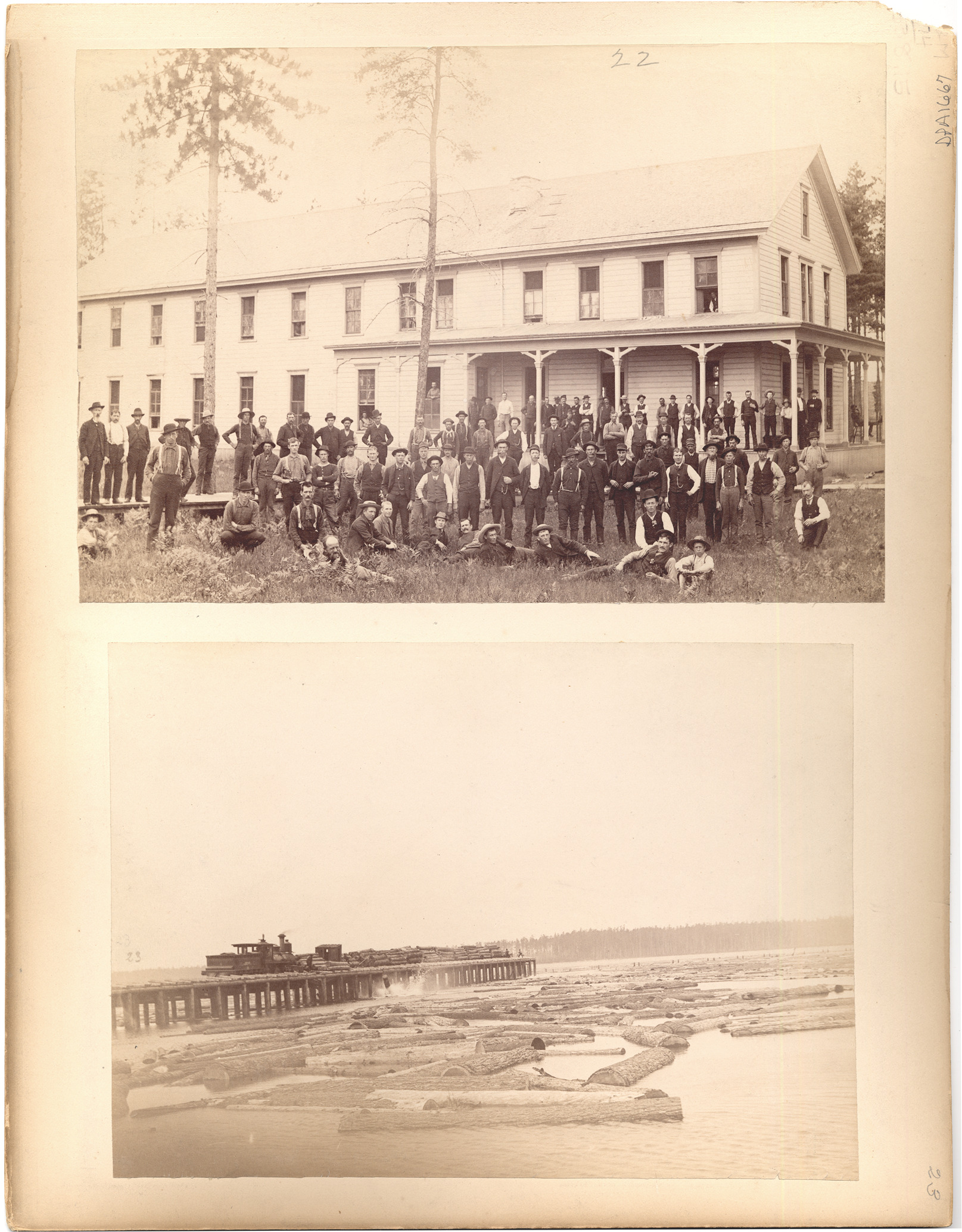 Favorite this☆ House and logging pier Description: Upper picture has large group of men and boys on side of large house with wrap-around porch. Some men in windows. Lower picture shows floating logs by pier with locomotive and stacks of logs. Details Resource ID: DPA1667 Subject: Logging--Michigan Wooden-frame buildings--Michigan Log transportation--Michigan Albumen prints Photographic prints Date Issued: Unknown year Format: 2 photographic prints mounted on mat board ; image 12.75 x 9 in. Member of: Burton Historical Collection Filing Location: M/Lumber industry & trade Note (Content): DPA1666 on other side of mat Rights: Physical rights are retained by DPL. Copyright is retained in accordance with U.S. copyright laws.