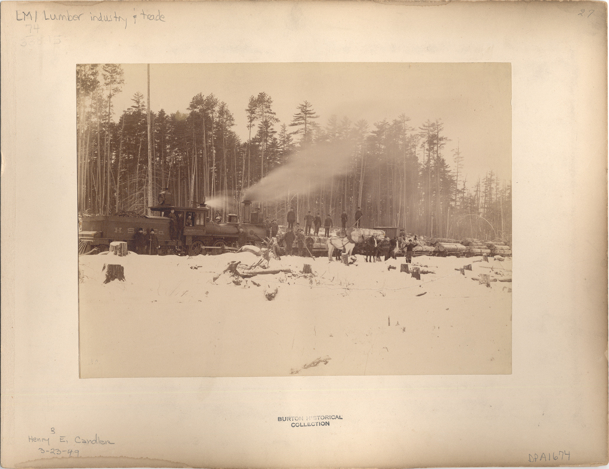 Locomotive with tender pushing flatcars loaded with logs. Three men in cab. Loggers posed on load and by track. Two horse teams by track. Snow-covered stumps in foreground.