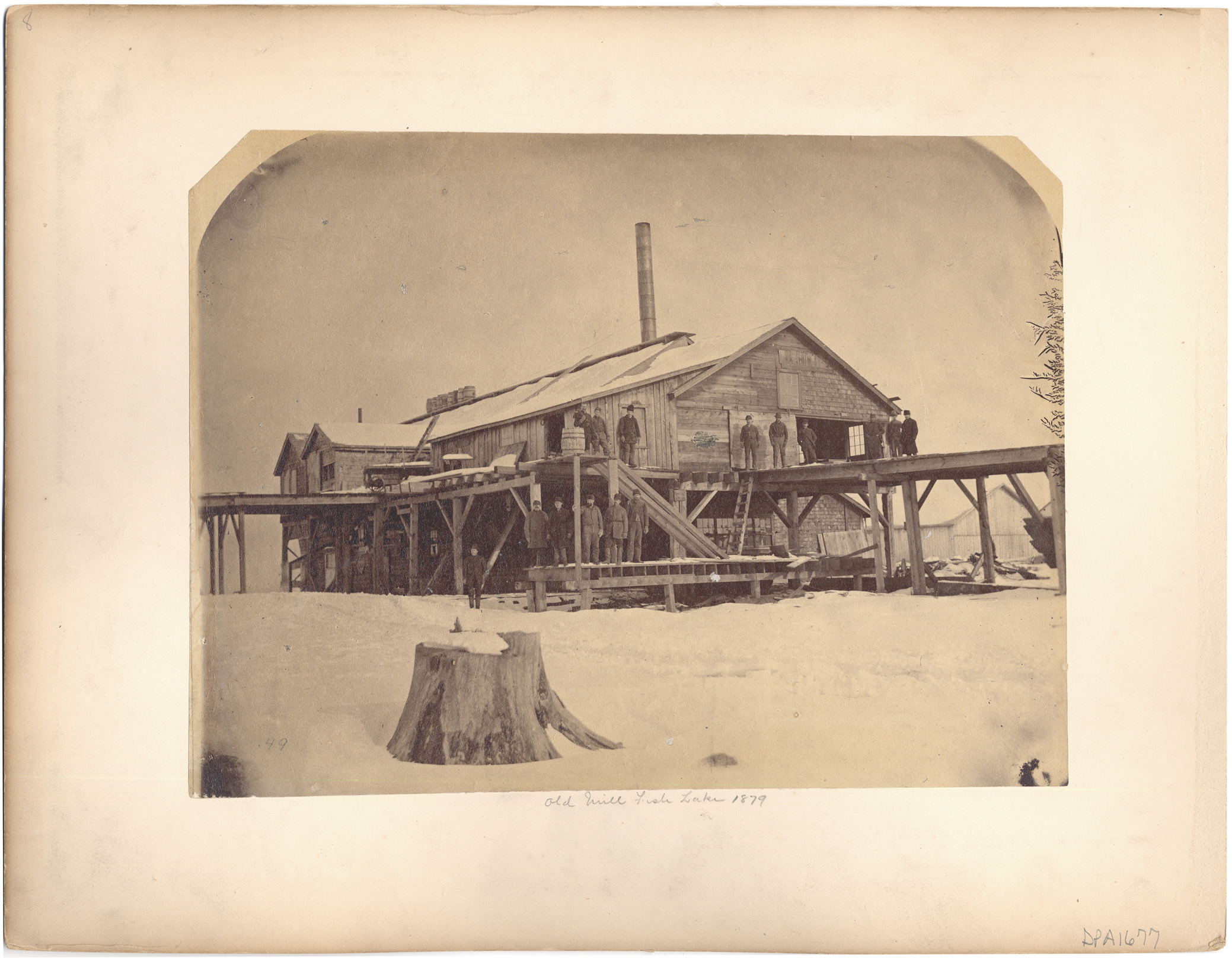 Favorite this☆ Sawmill at Fish Lake Description: Sawmill on snow-covered cleared land with stumps. Workers on platforms. Handwritten on mat front: "Old mill Fish Lake, 1879." Details Resource ID: DPA1677 Subject: Sawmills--Michigan Sawmill workers--Michigan Albumen prints Photographic prints Date Issued: 1879 Format: 1 photographic print on mat board ; image 7.5 x 10 in. Member of: Burton Historical Collection Filing Location: LM/Lumber Industry & Trade Note (Content): DPA1676 on other side of mat Rights: Physical rights are retained by DPL. Copyright is retained in accordance with U.S. copyright laws.