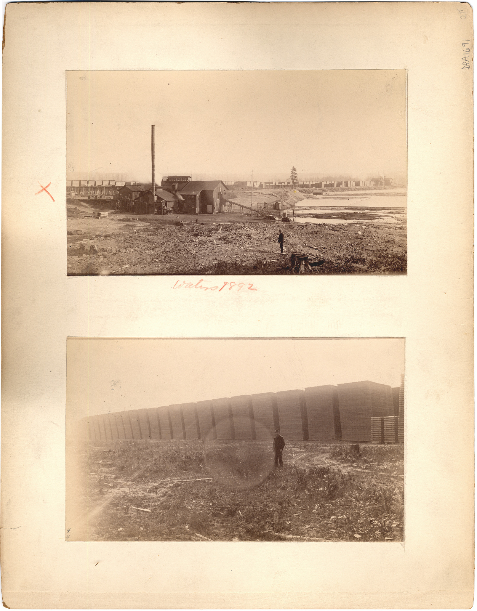 Favorite this☆ Sawmill and lumber-yard Description: Top picture shows sawmill with lumberyard behind. Ramp leading to floating logs. Man stands alone in foreground. Handwritten on mat front: "Waters 1892." Lower picture shows man standing in front of stacked boards. Details Resource ID: DPA1691 Subject: Sawmills--Michigan Sawmill workers--Michigan Lumber-yards--Michigan Albumen prints Photographic prints Date Issued: 1892 Format: 2 photographic prints mounted on mat board ; image 10.75 x 7.75 in. Member of: Burton Historical Collection Filing Location: M/Lumber industry & trade Note (Content): DPA1690 on other side of mat Rights: Physical rights are retained by DPL. Copyright is retained in accordance with U.S. copyright laws.