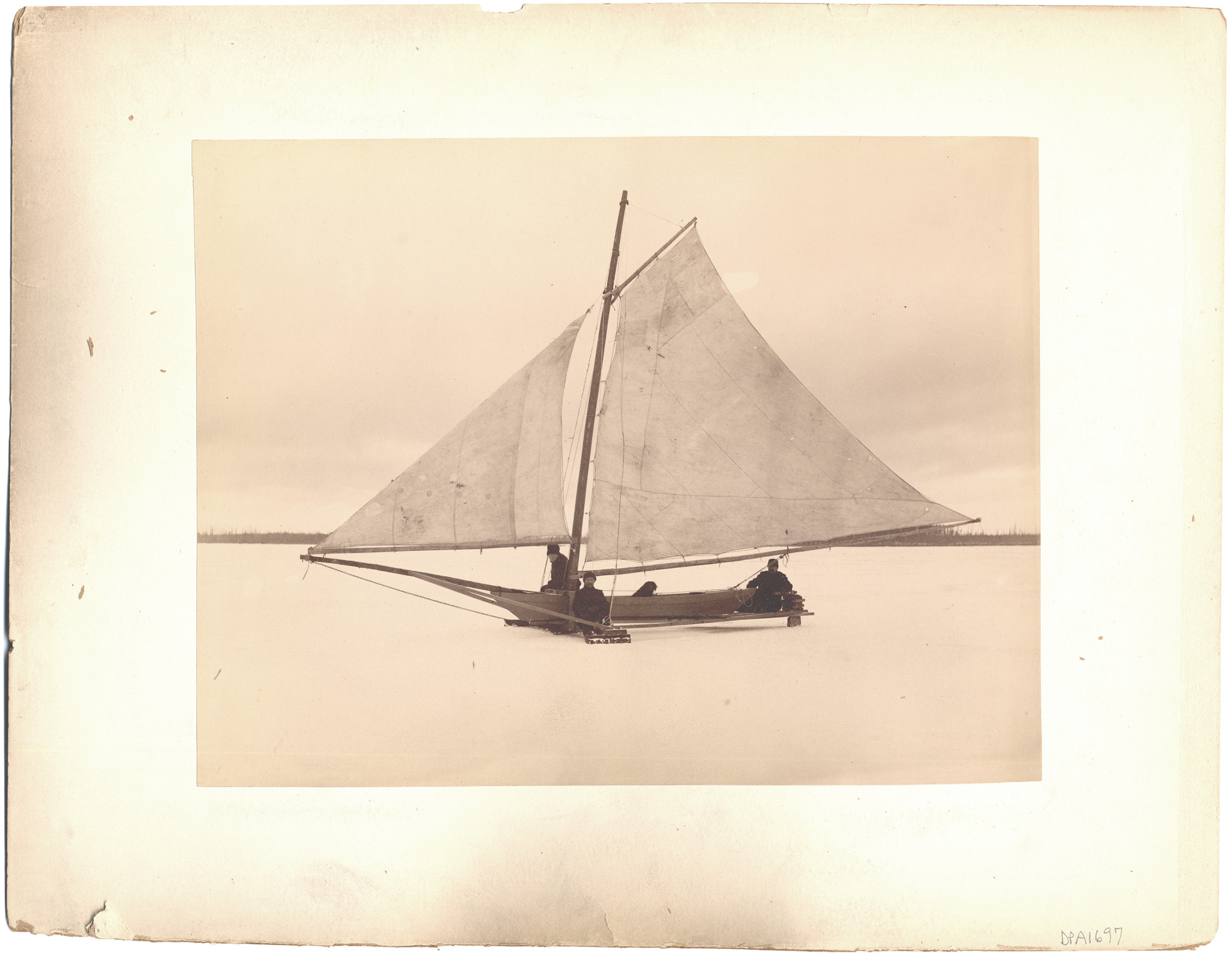 Favorite this☆ Iceboat Description: Three men and dog in iceboat on frozen lake, sails spread. Details Resource ID: DPA1697 Subject: Iceboating--Michigan Albumen prints Photographic prints Date Issued: Unknown year Format: 1 photographic print mounted on mat board ; image 7.5 x 9.5 in. Member of: Burton Historical Collection Filing Location: LM/Lumber industry and trade Note (Content): DPA1696 on other side of mat Rights: Physical rights are retained by DPL. Copyright is retained in accordance with U.S. copyright laws.