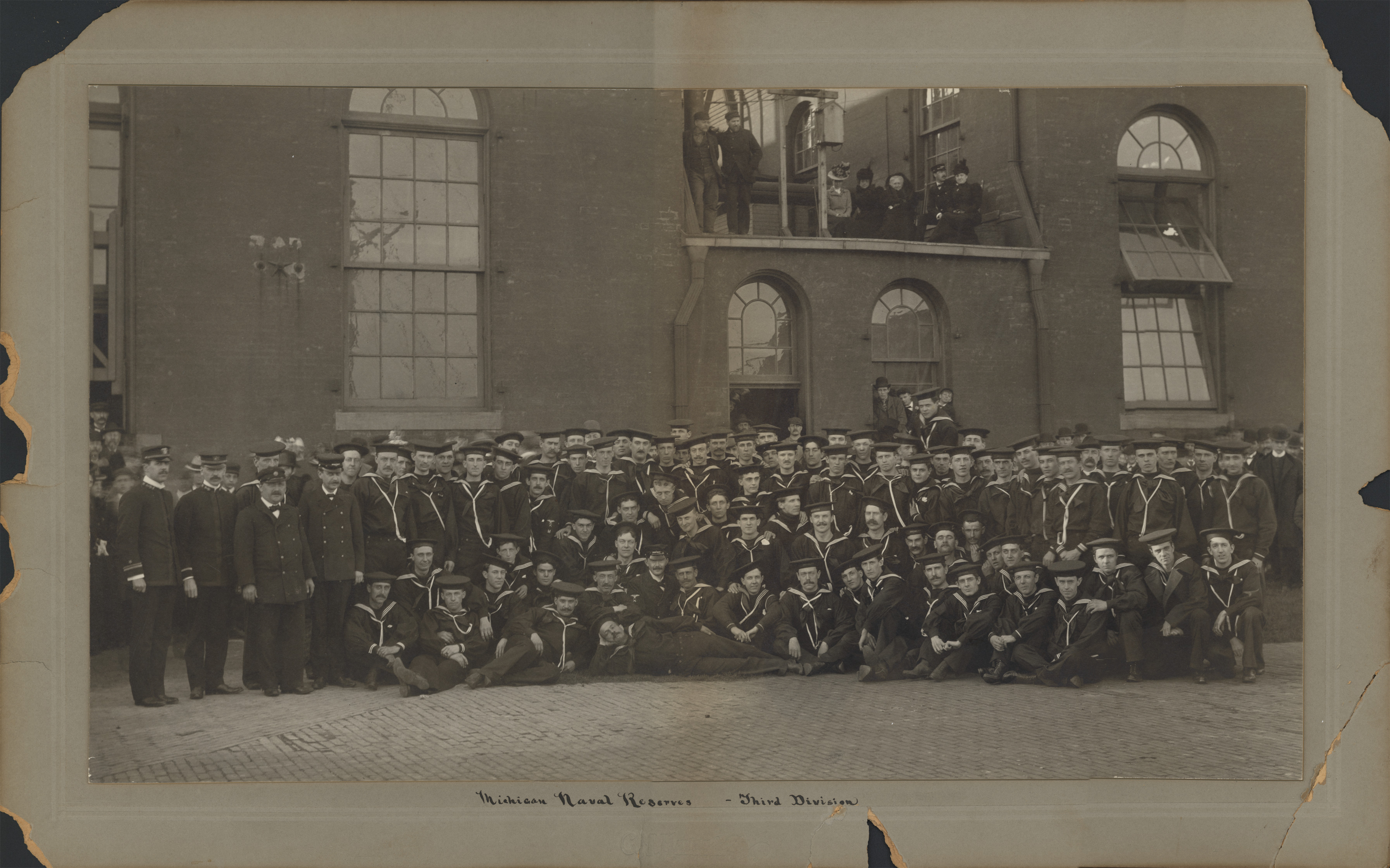Third Division of the Michigan Naval Reserves posed in group shot in front of building, some women and civilian men sitting outside second level. Written on photo front: "Michigan Naval Reserves - Third Division." Embossed on photo front: "C.M. Hayes & Co., Detroit, Mich."