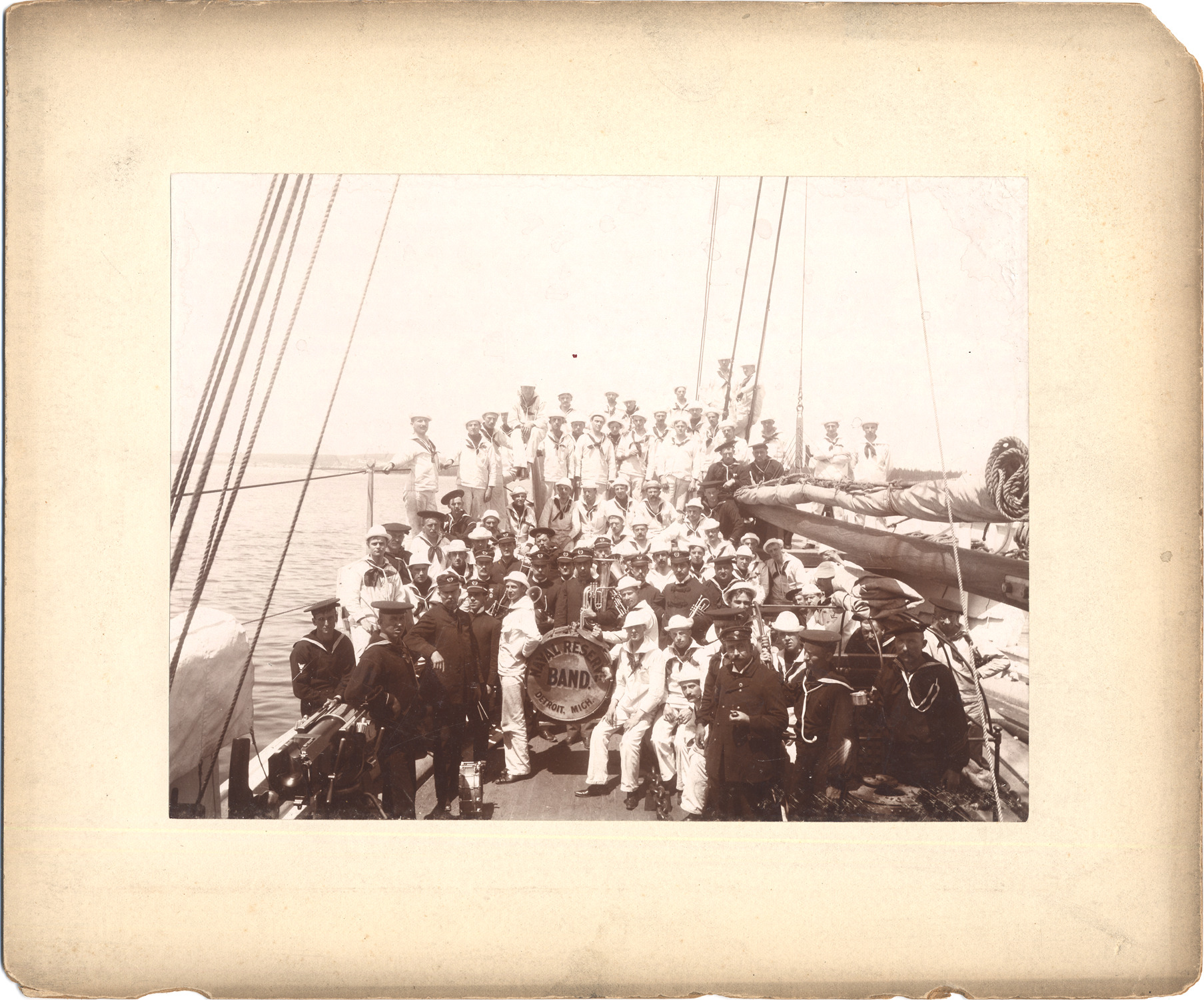 Favorite this☆ Detroit Naval Reserve band on board ship Description: Sailors of Michigan State Naval Brigade (formed in 1893) with band members of the Naval Reserve Band of Detroit. On deck of sailing ship. Details Resource ID: DPA1700 Subject: Bands (Music) Michigan--Naval militia Naval reserves Sailing ships--Michigan Albumen prints Photographic prints Date Issued: Unknown year Format: 1 photographic print mounted on mat board ; image 6.5 x 8.75 in. Member of: Burton Historical Collection Filing Location: LM/Michigan State Naval Brigade Rights: Physical rights are retained by DPL. Copyright is retained in accordance with U.S. copyright laws.