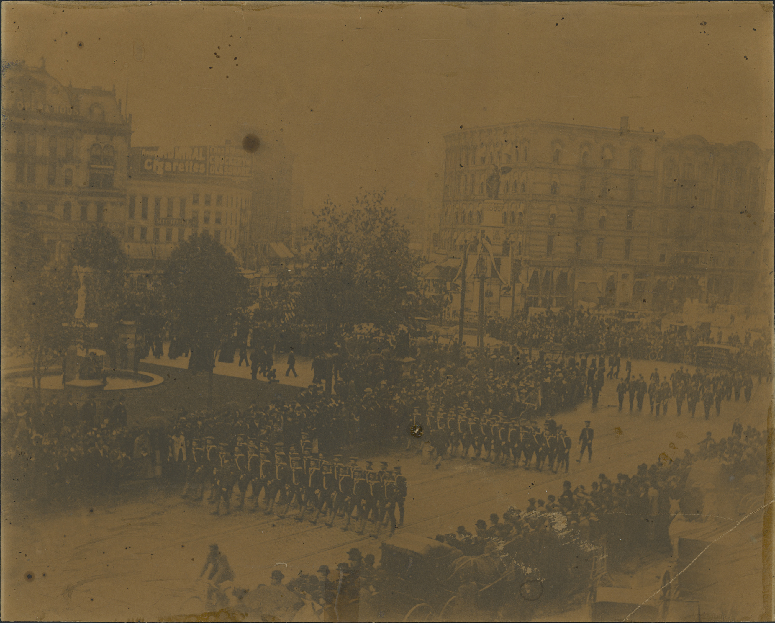 Naval Reserve marching on Woodward past the Detroit Opera House (Campus Martius). Signs for Opera House and Michell's drugstore. War memorial on traffic island and fountain in park. Horse-drawn carriages. Stamped on card back: "From Alvord & Co., exclusively, commercial photographers, 55 Rowland St., Detroit, Mich., ground floor." Typed on label on mat back: "'The old guard,' first parade of Detroit Naval Reserve, Charles C. Poe - Lieutenant, Gilbert Wilkes - Lieutenant, F.D. Standish - Ensign, W. Howie Muir - Ensign, Henry B. Joy - B.M.1, G.E. Lothrop - B.M.2, S. Hendrie - G.M.2, W.H. Burtenshaw - Cox., H.H. Sanger - Cox., H.M. Jewett - Cox., Paul F. Bagley - Lds., [all remainder Lds.] J.E. Bartlett, Benjamin P. Brodie, C.H. Campbell, David S. Carter, Emory W. Clark, A.J. Ducharme, William A. Dwyer, T.G. Fletcher, Stuart A. Fraser, F.B. Gaylord, Paul R. Gray, D.F. Godfrey, Samuel S. Harris, William P. Harris, J.A. Hinchman, J. Elliott Hunt, Henry K. Jones, Richard P. Joy, Charles B. King, T.E. Lockwood, Henry B. Lewis, J.C. Liggett, H.D. McMillan, S.T. Miller, J.S. Newberry, T.H. Newberry, John T. Nichols, William J. O'Brien, L.H. Paddock, Charles L. Palms, Delos L. Parker, Ed. H. Parker, W.R. Parker, Oliver Phelps, C.A. Rathbone, William E. Rice, H.H. Robinson, George K. Root, Alexander H. Sibley, Crapo C. Smith, M.S. Smith, 2nd., Charles B. Warren, F.S. Werneken, Alexander B. Wetmore, L.D. Wight, M.S. Williams, Charles S. Witbeck, Ernest S. Witbeck. Presented by Henry B. Joy. From Kodac [Kodak?] taken by James Joy. First parade of first division, Michigan State Naval Brigade, at Detroit, Michigan, Decoration Day, May 30th, 1894. Lietuenant Charles Carroll Poe, Lieut. Com'd'g Div. First Division M.S.N.B. Organized at Detroit on February 28, 1894."