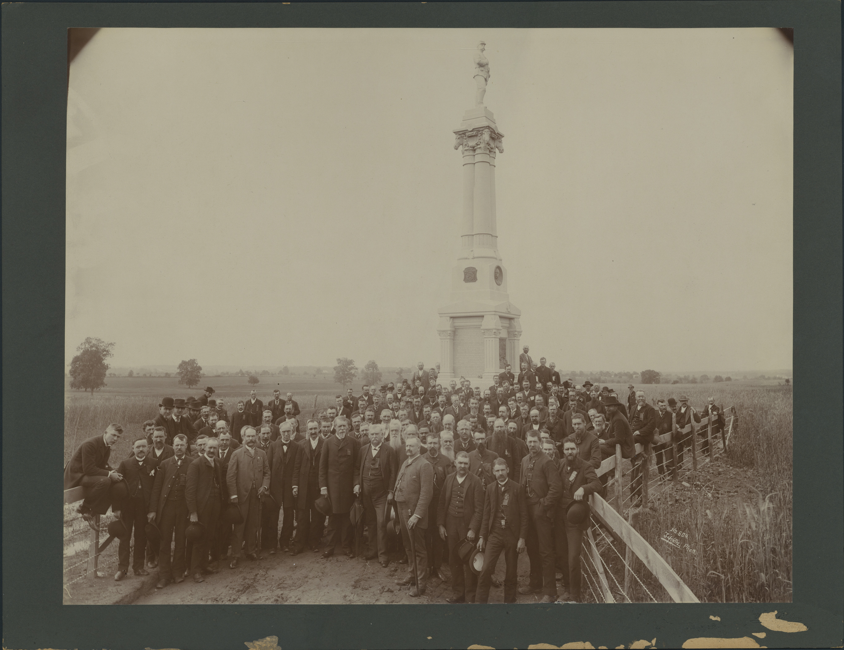 Pillared monument with standing cavalryman on top, surrounded by veterans in civilian clothes, in fenced area of field. Printed on photograph front: "No.604, Tipton, photo." Printed on duplicate mat front: "Tipton's Gettysburg groups, photo. by W.H. Tipton, the battlefield photographer, Gettysburg, Pa." Printed on label on mat back: "Dedication of monument of Michigan Cavalry Brigade (1st--5th--6th and 7th Mich. Cavalry) at Gettysburg, June 12th, 1889."