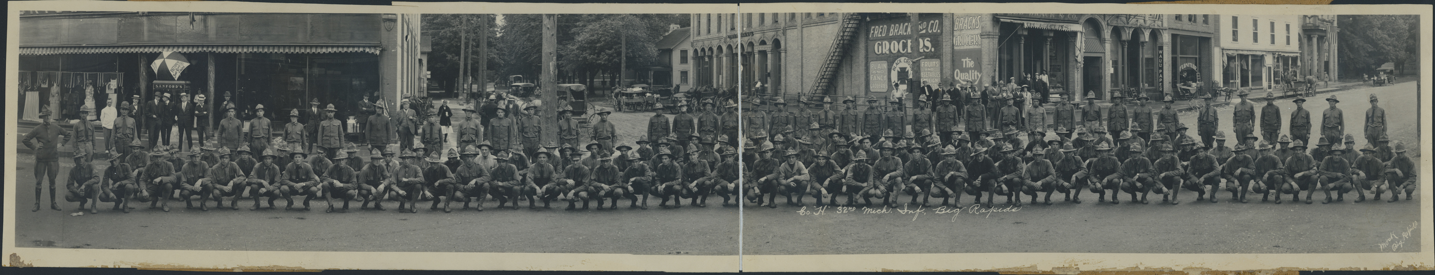 Soldiers in lines on major street. Most squat in two lines, with a few standing behind. Scattered groups of civiliains. Stores include Sanford's department store, Fred Brack & Co. grocers, and stores selling wallpaper and furniture. View up residential street. Many carriages and wagons, one car. Umbrella in Sanford's window advertises: "Patton's sun proof saint." Written on photograph front: "Co. 'H' 32nd Mich. Inf. Big Rapids. Mock, Big Rapids." Hinged photograph.