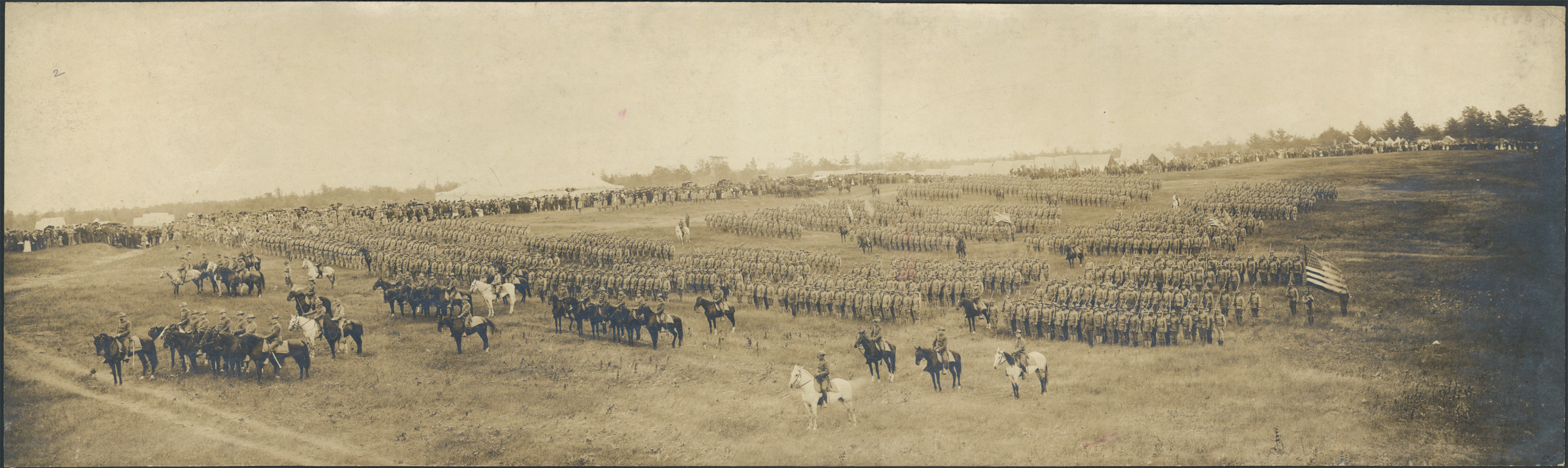 Michigan National Guard in ranks in field, with mounted officers. Spectators in front of tents, with trees in background.