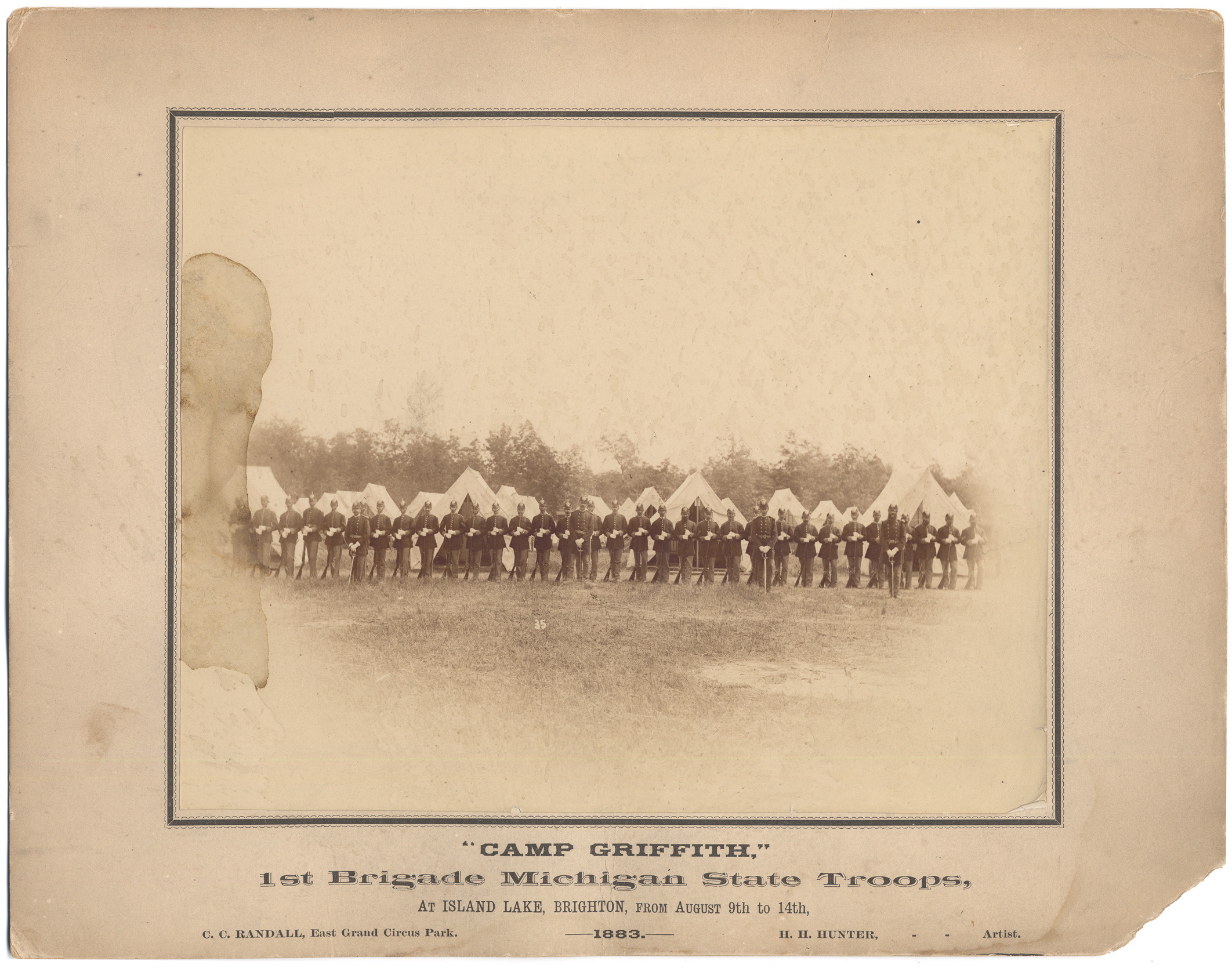 Favorite this☆ First Brigade on parade Description: Soldiers on parade in front of ranked tents. Printed on mat front: "'Camp Griffith,' 1st Brigade Michigan State Troops, at Island Lake, Brighton, from August 9th to 14th, 1883. C.C. Randall, East Grand Circus Park, H.H. Hunter, artist." Details Resource ID: DPA1719 Creator: Randall, Corydon C. Hunter, Hiram H. Subject: Michigan--National Guard Military camps--Michigan--Brighton Drill and minor tactics--Michigan--Brighton Photographers--Michigan--Detroit Albumen prints Photographic prints Date Issued: 1883-08 Format: 1 photographic print mounted on mat board ; image 8 x 10 in. Member of: Burton Historical Collection Filing Location: LM/Militia Rights: Physical rights are retained by DPL. Copyright is retained in accordance with U.S. copyright laws.