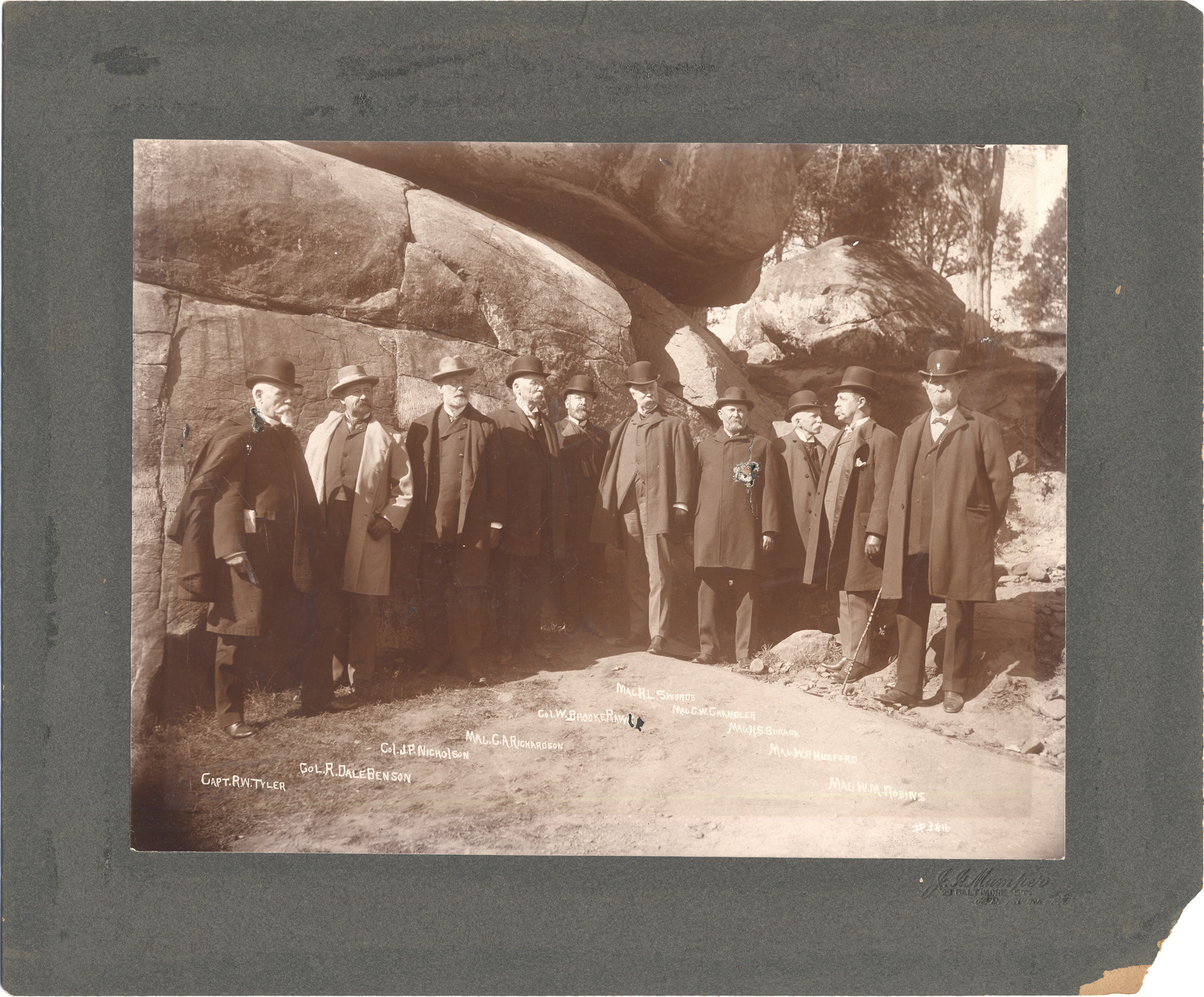 Members of MOLLUS, in reunion at Gettysburg. Embossed on mat front: "J.I. Mumpre (?), 29 Baltimore St., Gettysburg." Names written on photograph under each man: "Capt. R.W. Tyler, Col. R. Dale Benson, Col. J.P. Nicholson, Maj. C.A. Richardson, Col. W. Brooke Rawle, Maj. H.L. Swords, Maj. C.W. Chandler, Maj. H.S. Buraga, Maj. W.P. Huxford, Maj. W.M. Robins, #3816." Handwritten on mat back: "'Devil's Den,' Gettysburg, Oct. 25th, 1901."