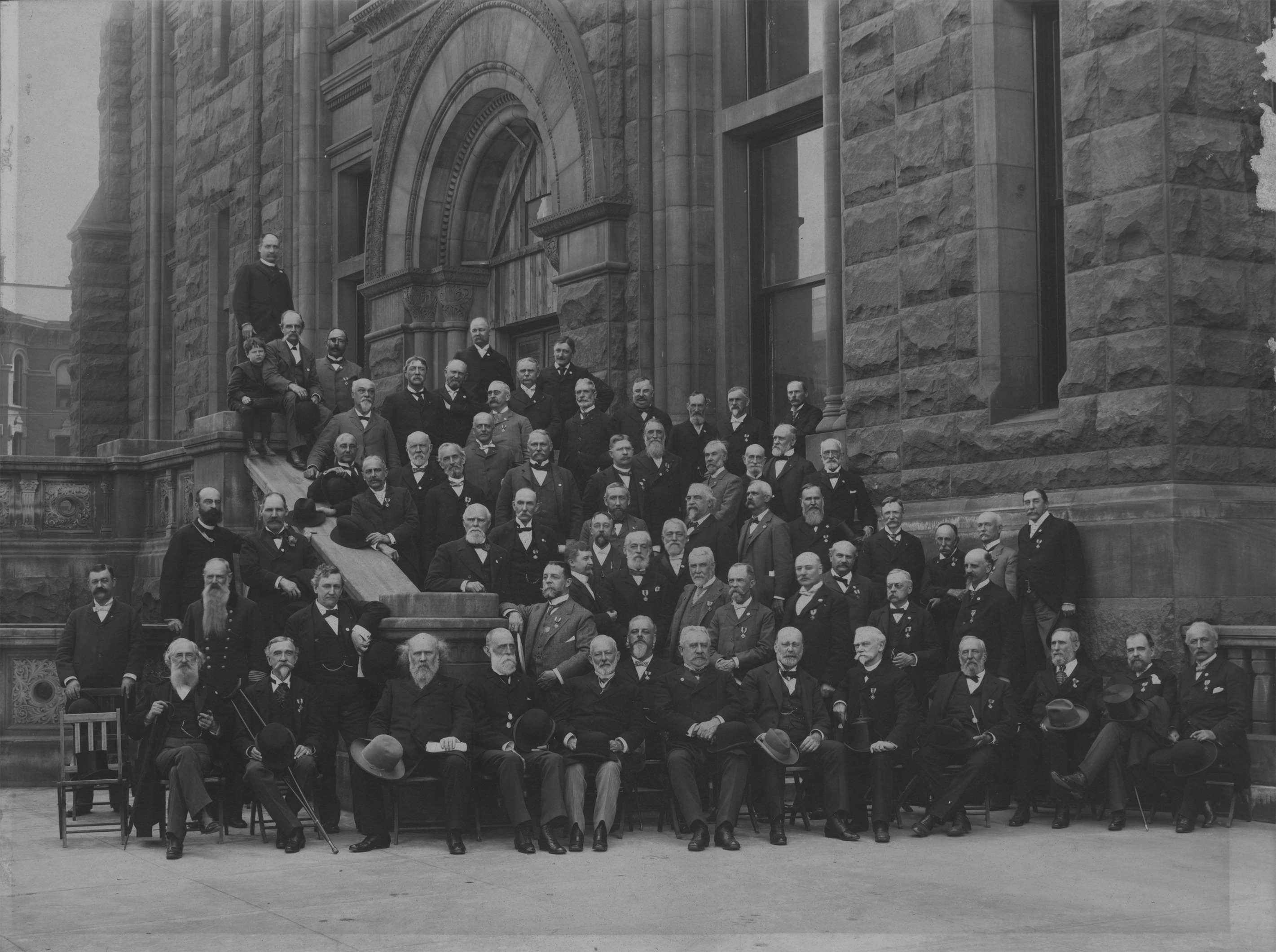 Favorite this☆ Group portrait of members of MOLLUS Description: Members of MOLLUS posed on steps of unidentified building, one small boy in picture. Emulsion damaged on upper right side of photo. Stamped on mat back: "Hughes & Sarjeant, photographers, 242 Woodward Ave., Detroit, Mich." Details Resource ID: DPA1744 Creator: Hughes & Sarjeant Subject: Military Order of the Loyal Legion of the United States--Portraits Portraits, Group--Michigan--Detroit Photographers--Michigan--Detroit Photographic prints Date Issued: Unknown year Format: 1 photographic print mounted on mat board ; 14.25 x 19 in. Member of: Burton Historical Collection Filing Location: LM/Organizations-Military Order of the Loyal Legion of the United States Rights: Physical rights are retained by DPL. Copyright is retained in accordance with U.S. copyright laws.
