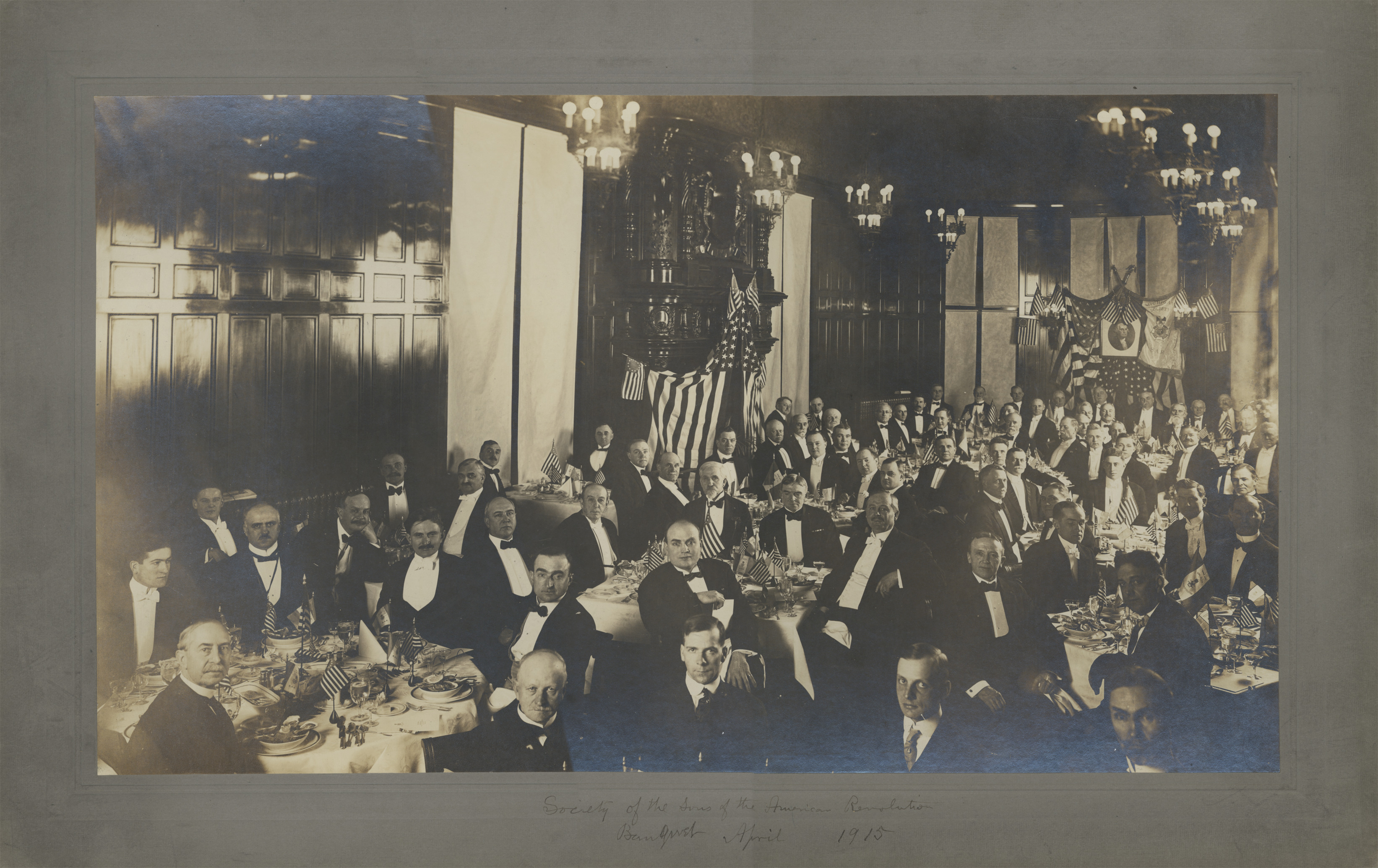 Men in evening dress at round tables in paneled hall decorated with U.S. flags, portrait of George Washington, and Michigan Society banner. Handwritten on mat front: "Society of the Sons of the American Revolution banquet, April, 1915."