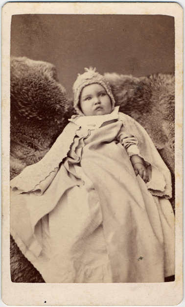 Portrait of an infant wearing a light colored dress and knit bonnet resting on piece of fur. Printed on the photo back: "James A. Major, photographer, Monroe Gallery, 21 Front Street East, Monroe, Mich."