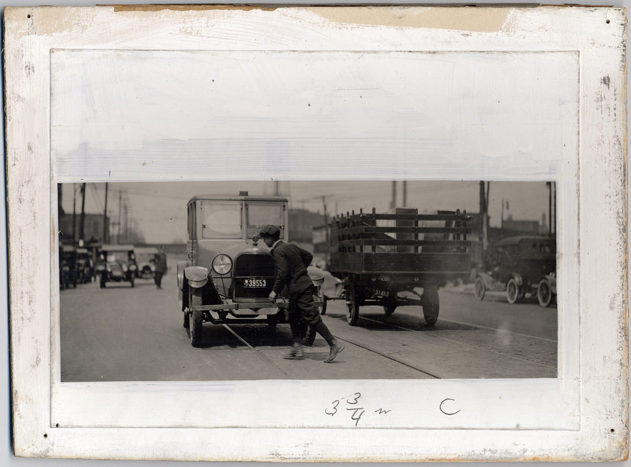 Staged photograph showing teenage boy running into the path of a car. Truck passing in opposite direction. Boy is dressed in knickers and cap.