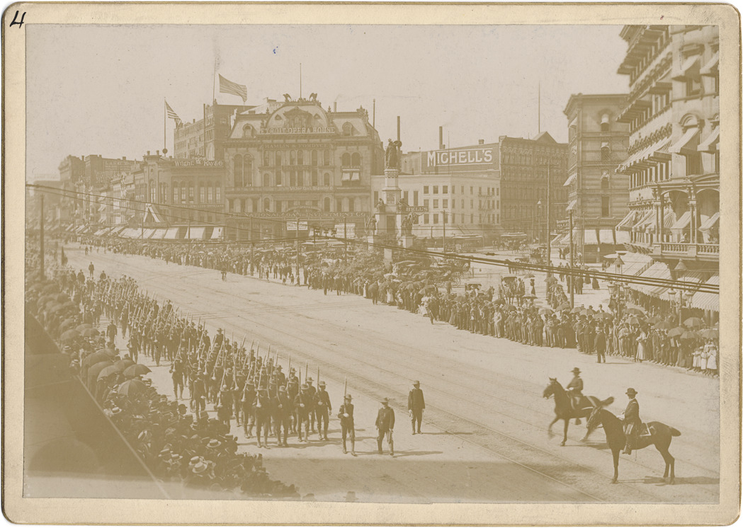 Uniformed soldiers marching on Woodward past the Detroit Opera House (Campus Martius). Mounted officers turned to face column. Sign for Michell's drugstore, Wright, Kay, & Co. Jewelers, National Loan & Investment Co., Hamlyn & Fordyce Real Estate, Victor Cash Register Co., L.A. Smith Co., Mills & Gibb. War memorial on traffic island. Handwritten on mat front: "4." Handwritten on mat back: "Decoration Day, 1895."