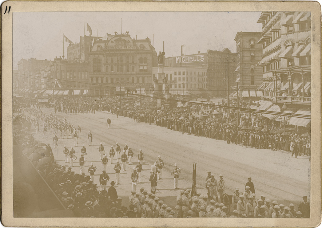 Marine band marching on Woodward past the Detroit Opera House (Campus Martius). Marines marching behind; sailors lined up on curb. Sign for Michell's drugstore, Wright, Kay, & Co. Jewelers, National Loan & Investment Co., Hamlyn & Fordyce Real Estate, Victor Cash Register Co., L.A. Smith Co., Mills & Gibb. War memorial on traffic island. Handwritten on mat front: "11." Handwritten on mat back: "Decoration Day, 1895."