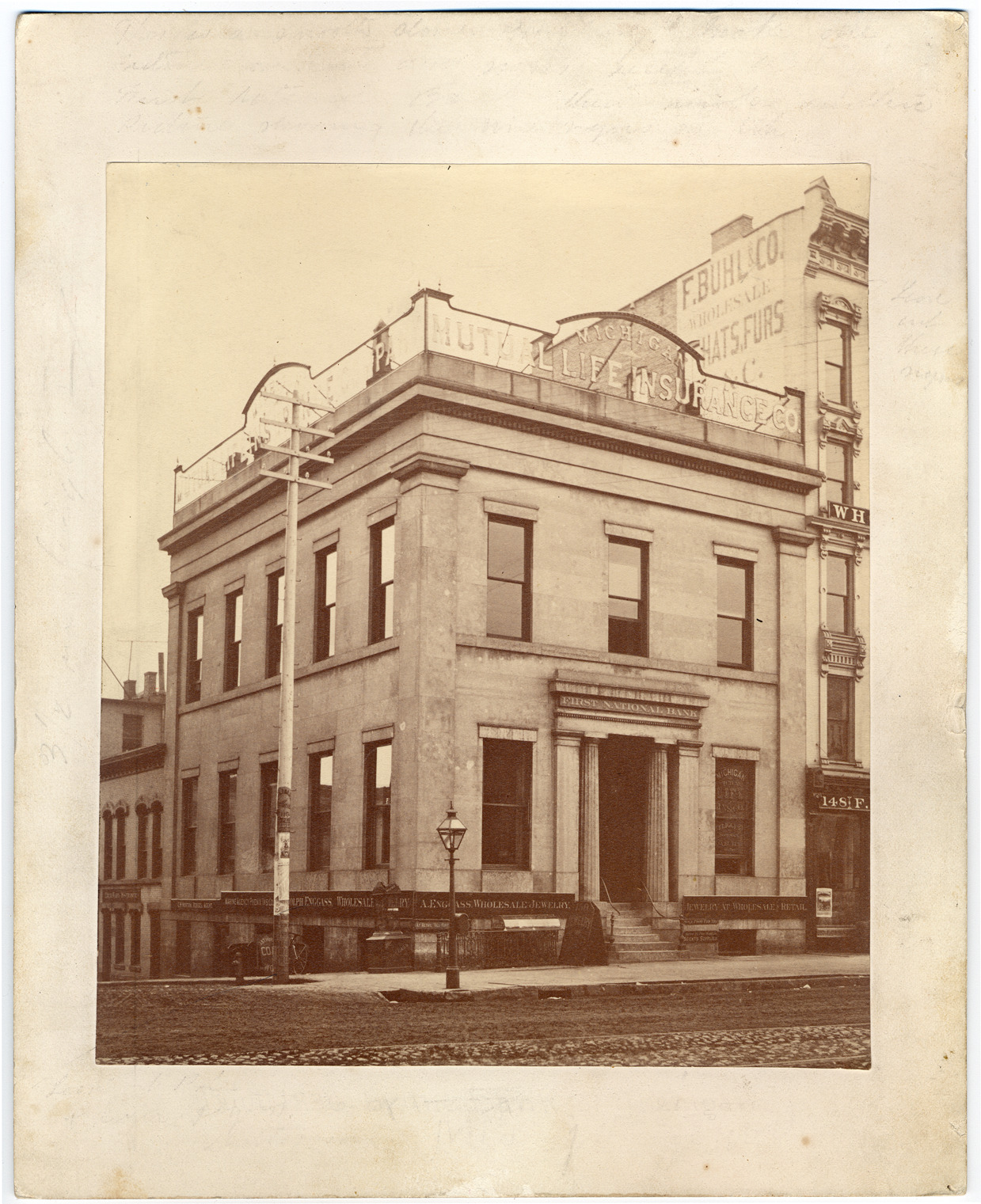 Close-up of building on corner of Jefferson and Griswold. Sign above doorway reads "First National Bank." Sign on top of building reads "Michigan Mutual Life Insurance." Sign on lower floor reads "A. Enggass Wholesale Jewelry." Handwritten on back: "SW Cor., Jefferson Ave. & Griswold 1881. Built 1836 by the Bank of Michigan. 'It is built of shell limestone, and the stories show many beautiful petrifactions; in older times the building was oiled yearly, and they were very noticable. When the Bank of Michigan failed, the building on Dec. 12, 1842 was sold at auction to the United States, for $32,000, and was used as a court-house and post-office.' Farmer's Detroit, V.1, p.859."