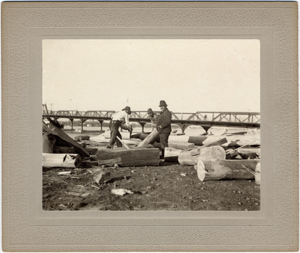 Several men shown sawing log; logs surround them on shore of Detroit River. Bridge to Belle Isle seen in background.