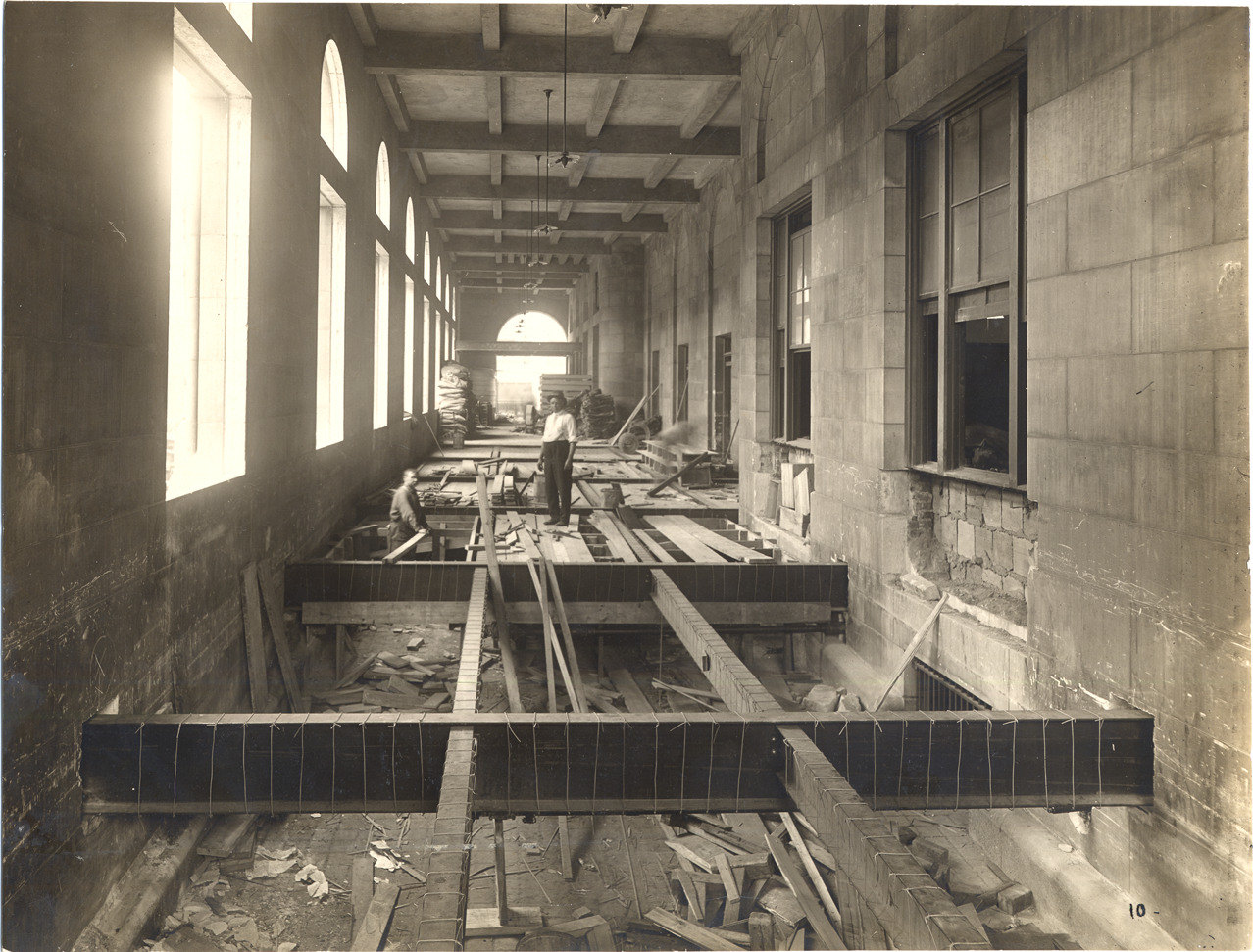 Interior of post office structure being built into side of existing stone building. Walls with large windows and ceiling are completed. Steel beams criss-cross floor; construction workers stand on wooden platform. Handwritten on back: "July 1, 1915."
