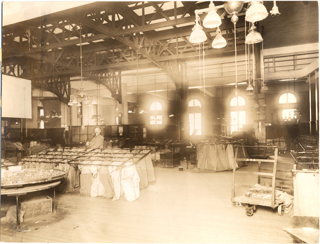 Favorite this☆ Mail sorting room in U.S. Post Office Description: Men sorting mail into canvas bags on racks. Bright sunlight through large arched windows, hanging lamps. Handwritten on photograph back: "from MS/U.S. Post Office & custom house." Details Resource ID: DPA1865 Subject: Post office buildings--Michigan--Detroit Mail sorting--Michigan--Detroit Postal service--Employees Albumen prints Photographic prints Date Issued: Unknown year Format: 1 photographic print mounted on fabric ; 6.5 x 8.5 in. Member of: Burton Historical Collection Filing Location: D/Buildings-Federal-Post Office (1897) Rights: Physical rights are retained by DPL. Copyright is retained in accordance with U.S. copyright laws.