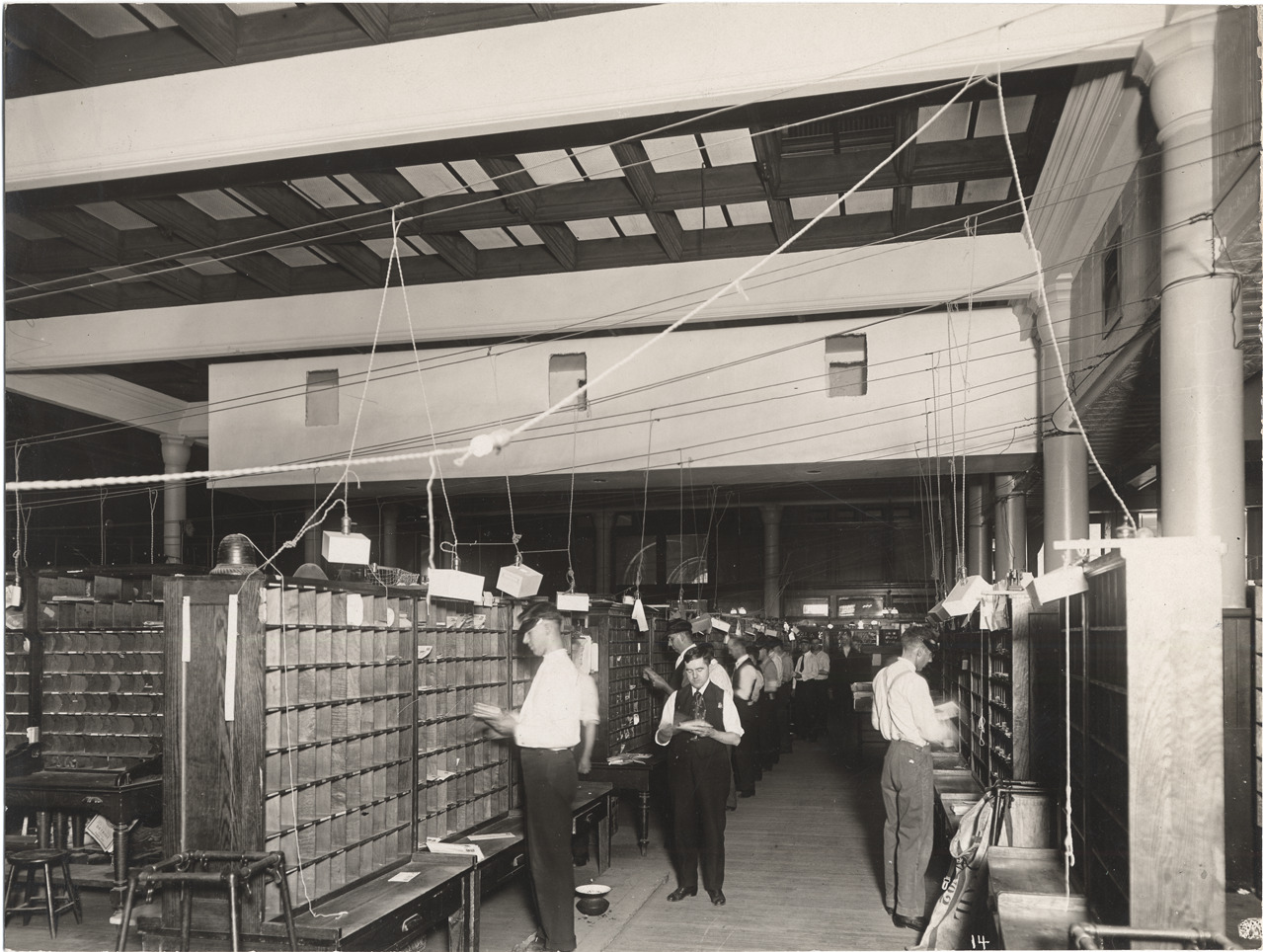 Favorite this☆ Mail sorting room in U.S. Post Office Description: Men sorting mail into wooden cubbyholes. Makeshift-looking lights with square reflectors. Handwritten on photograph front: "14." Handwritten on photograph back: "Sept. 1, 1915, from MS/U.S. Post Office & custom house." Details Resource ID: DPA1867 Subject: Post office buildings--Michigan--Detroit Mail sorting--Michigan--Detroit Postal service--Employees Albumen prints Photographic prints Date Issued: 1915-09-01 Format: 1 photographic print mounted on fabric ; 6.5 x 8.5 in. Member of: Burton Historical Collection Filing Location: D/Buildings-Federal-Post Office (1897) Rights: Physical rights are retained by DPL. Copyright is retained in accordance with U.S. copyright laws.