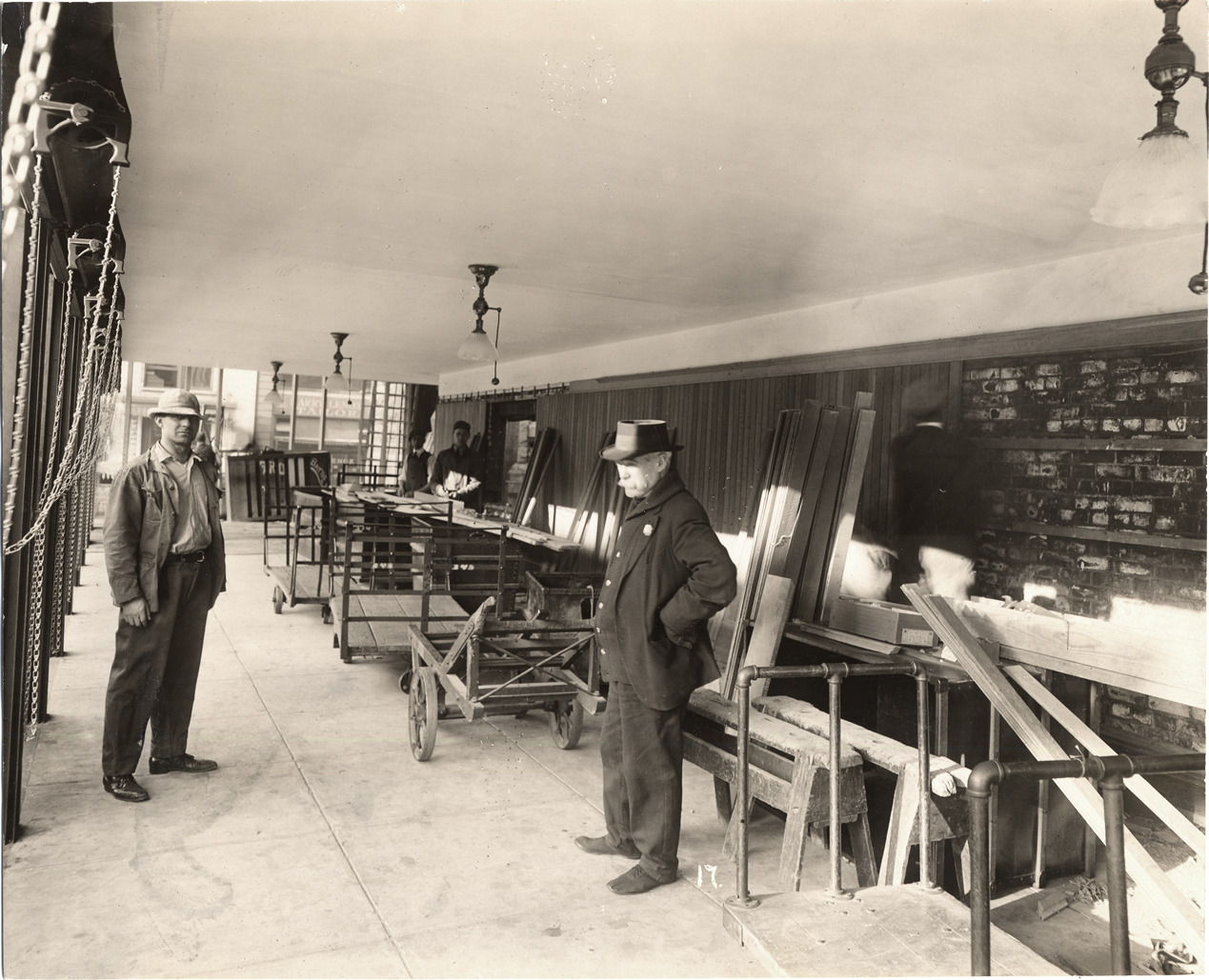 Favorite this☆ Loading dock in U.S. Post Office Description: Loading dock for mail. Several men on dock, handcarts, hanging lights, chains for moving loads. Written on photograph front: "17." Handwritten on photograph back: "Nov. 1, 1915, from Ms/U.S. Post Office & custom house." Details Resource ID: DPA1873 Subject: Post office buildings--Michigan--Detroit Mail sorting--Michigan--Detroit Postal service--Employees Albumen prints Photographic prints Date Issued: 1915-11-01 Format: 1 photographic print mounted on fabric ; 7 x 8.5 in. Member of: Burton Historical Collection Filing Location: D/Buildings-Federal-Post Office (1897) Rights: Physical rights are retained by DPL. Copyright is retained in accordance with U.S. copyright laws.