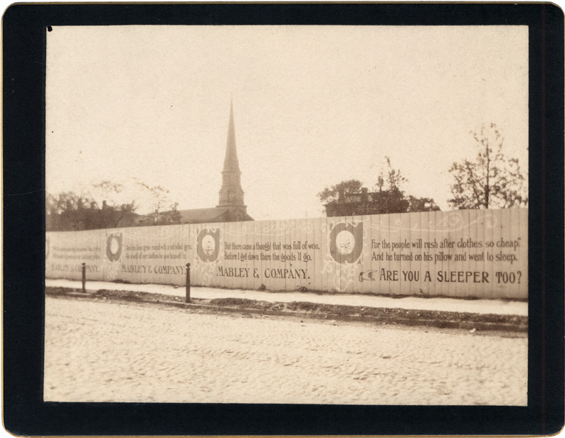 Fence around new U.S. Post Office site Description: Fence around construction site, with ads for Mabley & Company. Unpaved road with paved sidewalk. Church spire and buildings visible in background. Handwritten on card back: "The fence on east side of the new post office site. Nov. 1, 1891. C.M.B." Details Resource ID: DPA1874 Subject: Post office buildings--Michigan--Detroit Building sites--Michigan--Detroit Cabinet photographs Albumen prints Photographic prints Date Issued: 1891-11-01 Format: 1 cabinet card ; image 3.75 x 4.75 in. Member of: Burton Historical Collection Filing Location: D/Buildings-Federal-Post Office (1897) Rights: Physical rights are retained by DPL. Copyright is retained in accordance with U.S. copyright laws.