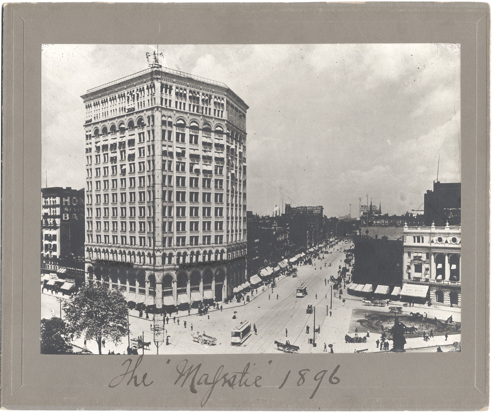 Majestic Building, at the corner of Woodward and Michigan. Streetcars, horse-drawn wagons, and pedestrians. Signs on neighboring buildings read: "Ho[me] Sav[ings] Ba[nk]," "Valpey Bros. Shoes," "Weil & Co. Furniture," "L.A. Smith & Co." Handwritten on mat front: "The 'Majestic,' 1896."