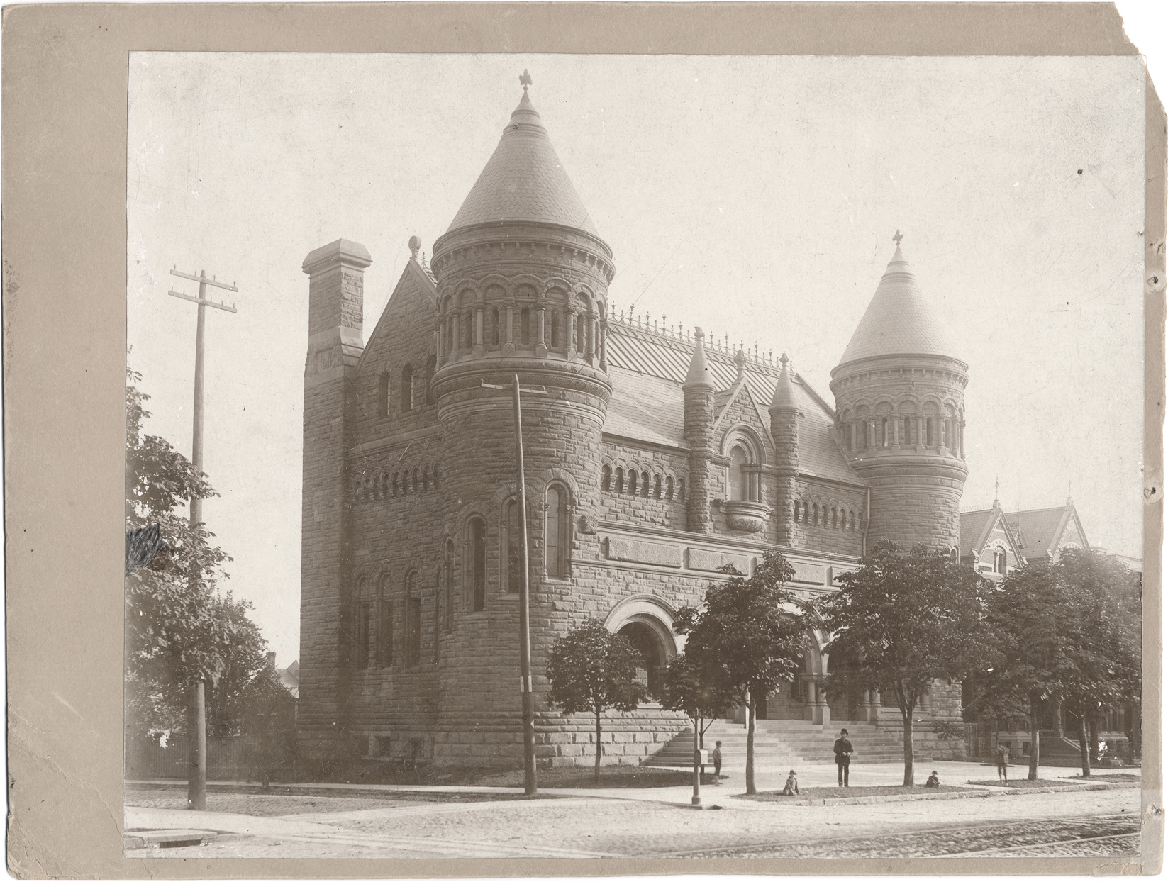 Original Detroit Museum of Art building, built in 1888. Romanesque stone building. Man and four boys in front by trees. Stamped on mat back: "Alvord & Co., 55 Rowland St., Detroit, Mich." Handwritten on mat back: "Detroit Museum of Art, s.w. cor. Jefferson Ave and Hastings St." Handwritten on duplicate mat back: "Old Detroit Museum of Art, 1889, s.w. corner Jefferson & Hastings."
