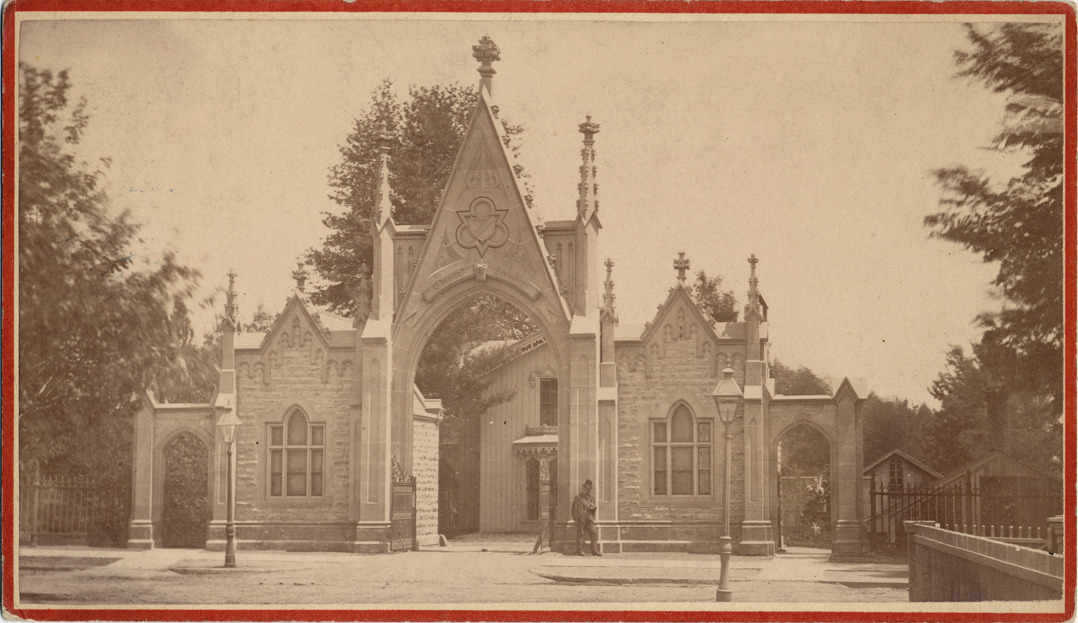 View of arched Gothic revival gateway. Wooden building and roofs partially visible through gateway. Man leaning next to gateway. Lampposts. Printed on label on card back: "New series. Panoramic and cabinet sketches, in and about the city of Detroit. Photographed and published by Jex Bardwell, 31 Monroe Ave." Handwritten on label: "Gateway of Elmwood Cemetery, 1880, Waterloo Street. Folder 2, 39."