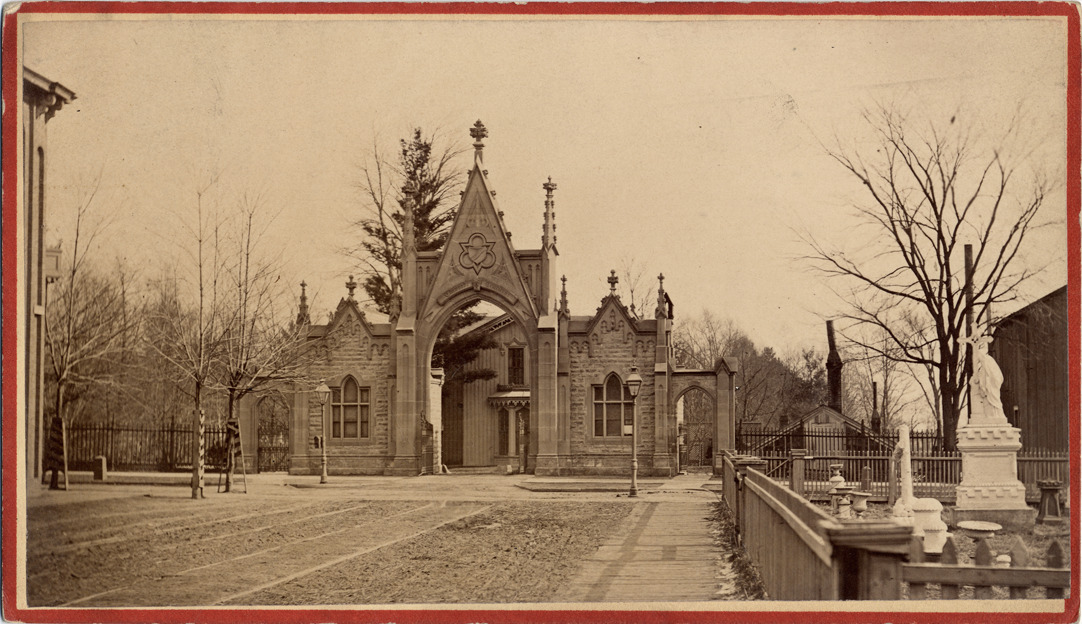 View of arched Gothic revival gateway at end of raked unpaved drive. Wooden building and roofs partially visible through gateway. Wooden sidewalk and monuments behind fence to the right. Printed on label on card back: "New series. Panoramic and cabinet sketches, in and about the city of Detroit. Photographed and published by Jex Bardwell, 31 Monroe Ave." Handwritten on label: "Gateway of Elmwood Cemetery, 1880, Waterloo Street. Folder 2, 40."
