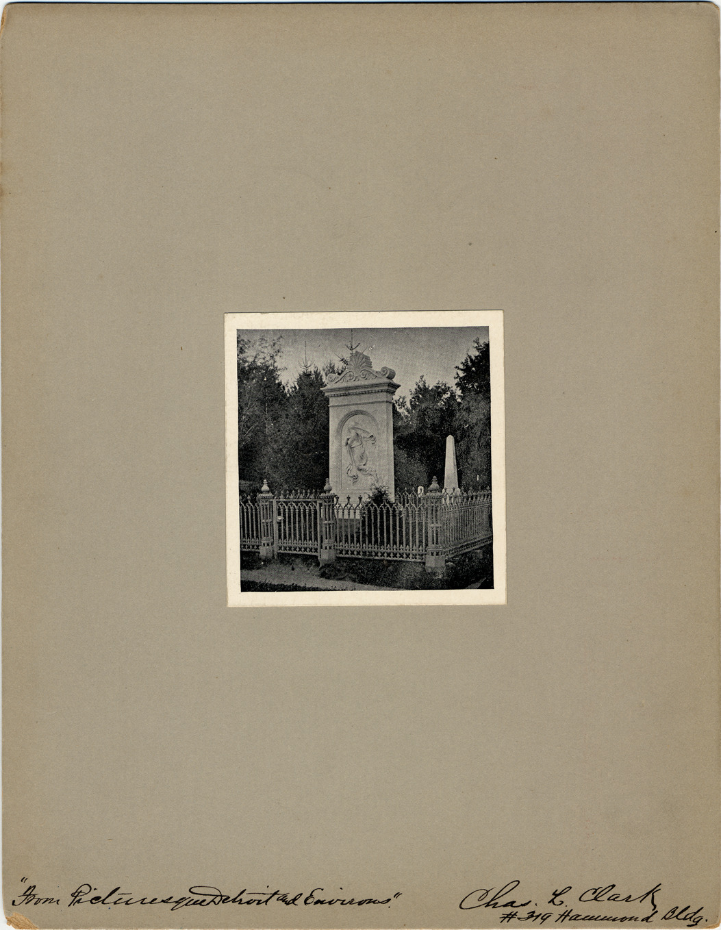 Carrera marble memorial stone with bas-relief figure (the Veiled Lady), inside fenced enclosure. Other monuments in background. Handwritten on mat front: "'From picturesque Detroit and environs,' Chas. L. Clark, #319 Hammond Bldg." Handwritten on mat back: "Waterman (Cameron) family, Elmwood Cemetery, by Randolph Rogers. Folder 2, 28."