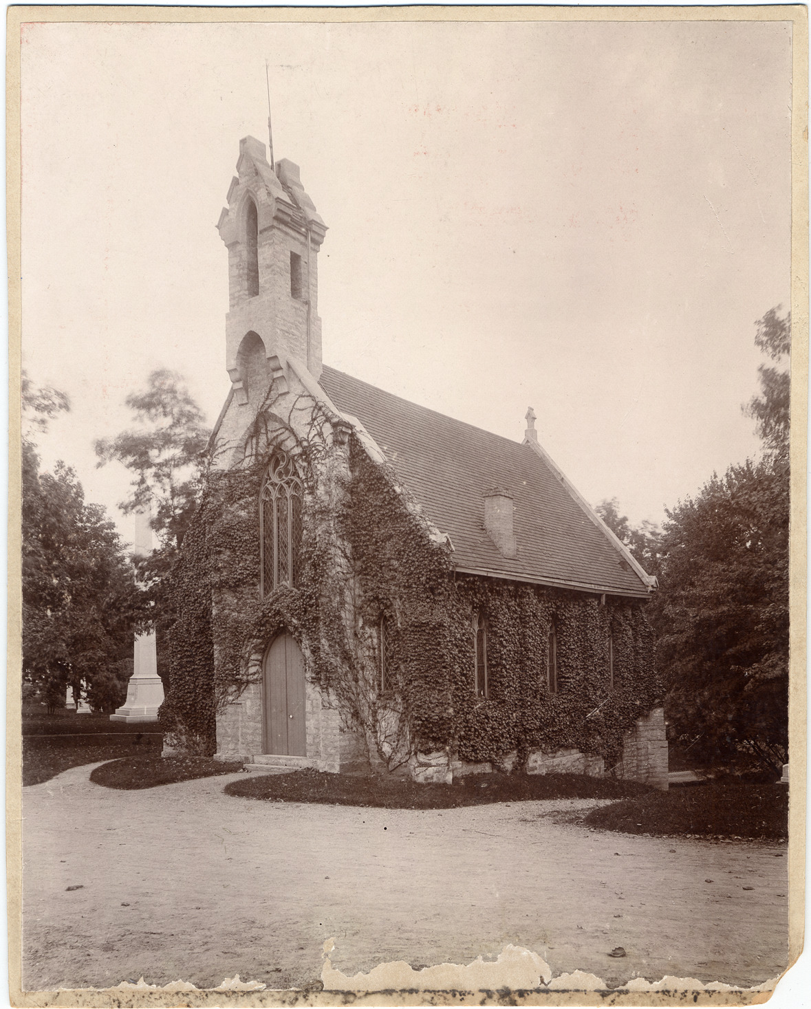 Ivy-covered stone chapel with leaded-glass ornamental windows, viewed across unpaved drive. Norman Gothic revival style, Elmwood website says built in 1856 and restored in 1961. Monuments visible beyond. Handwritten on mat back: "Chapel in Elmwood Cemetery, built in 1882. Folder 2, 37." Damage on lower edge of photograph and mat.